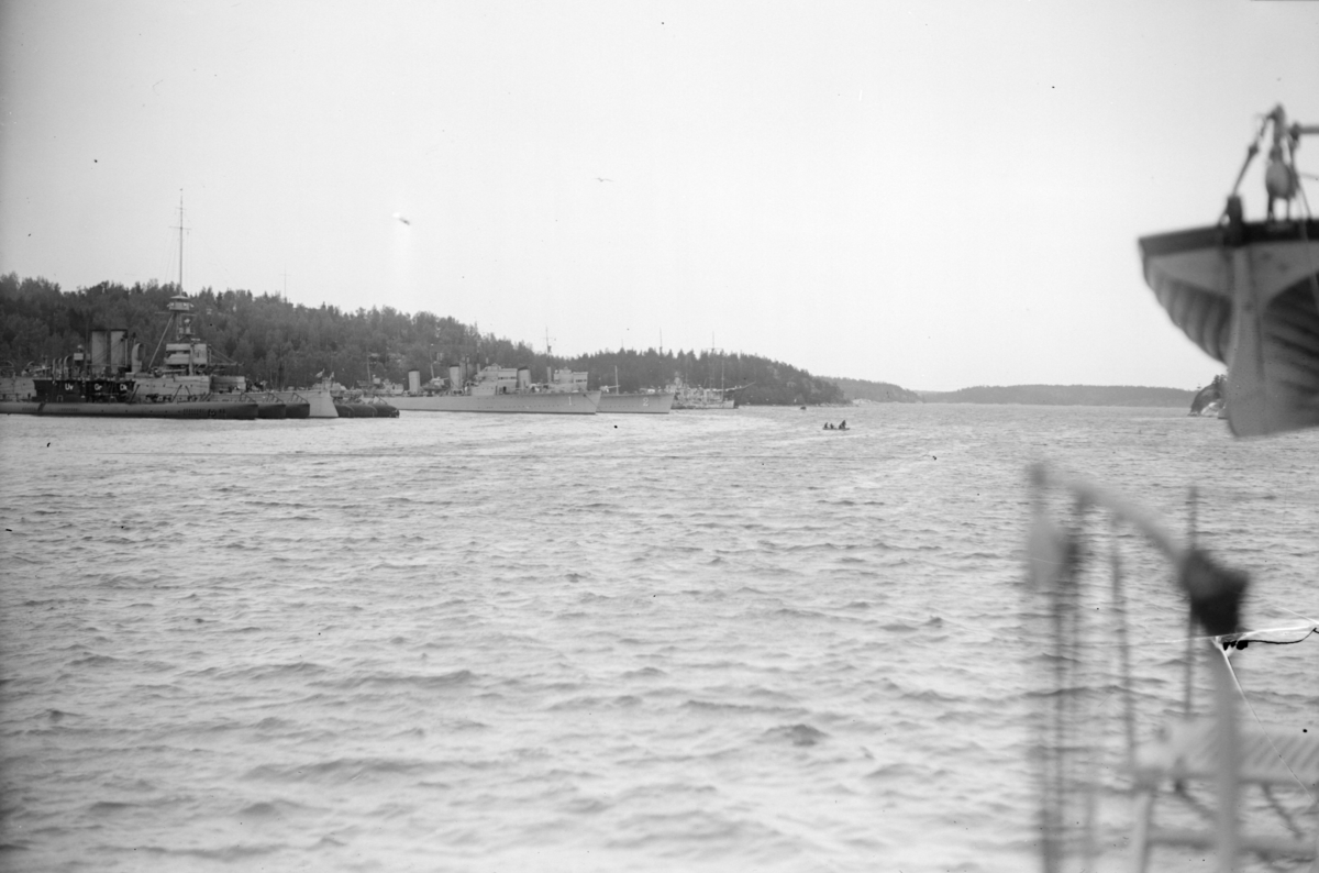 Torpedsprängning från fartyg till sjöss vid Hägernäs. I förgrunden syns ett fartyg med manskap.