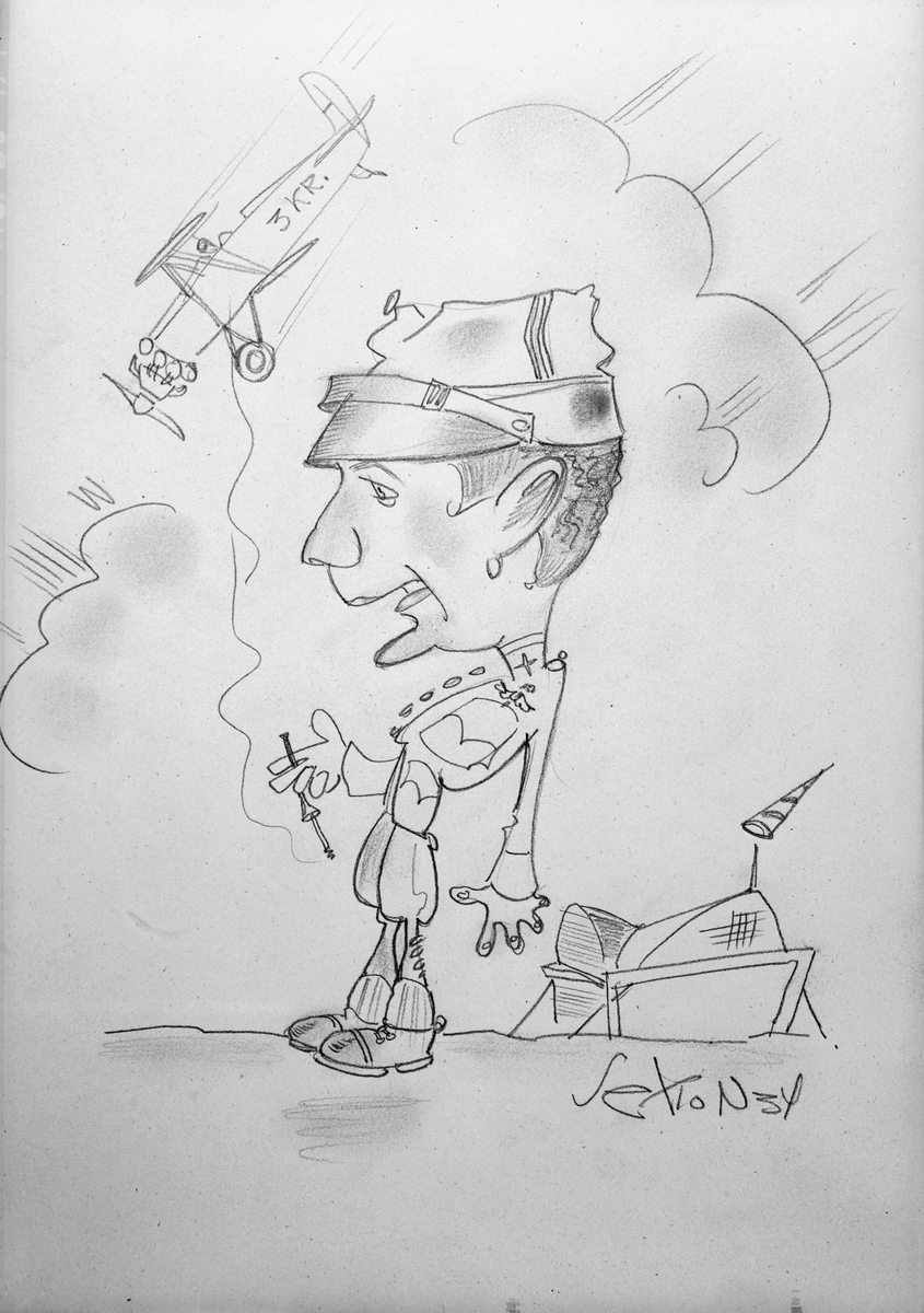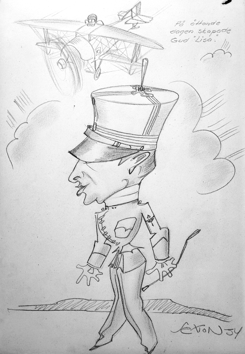 Karikatyrbild av överstelöjtnant Gösta von Porat ur flygvapnet vid F 3 Malmen. Avfotograferad teckning.