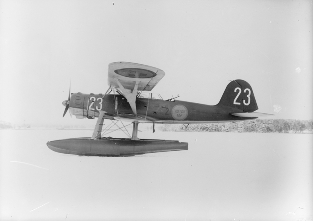 Flygplan S 12 märkt nummer 24 tillhörande F 2 Hägernäs i luften över skärgård. Flygplanet sett bakifrån.