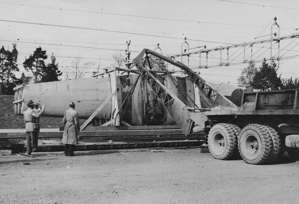 Avlastning och transport av flygplansvingar från järnvägsstationen i Malmslätt till CVM, Centrala Verkstäderna Malmslätt.