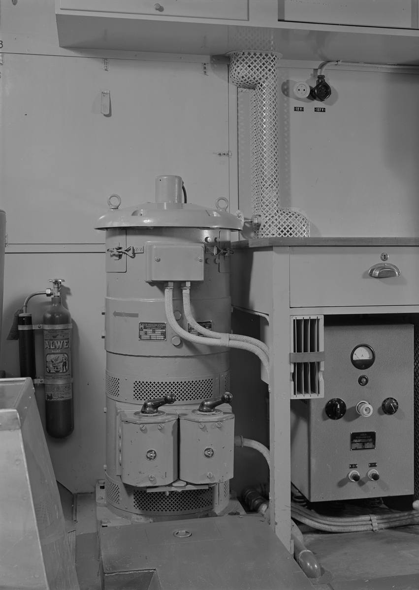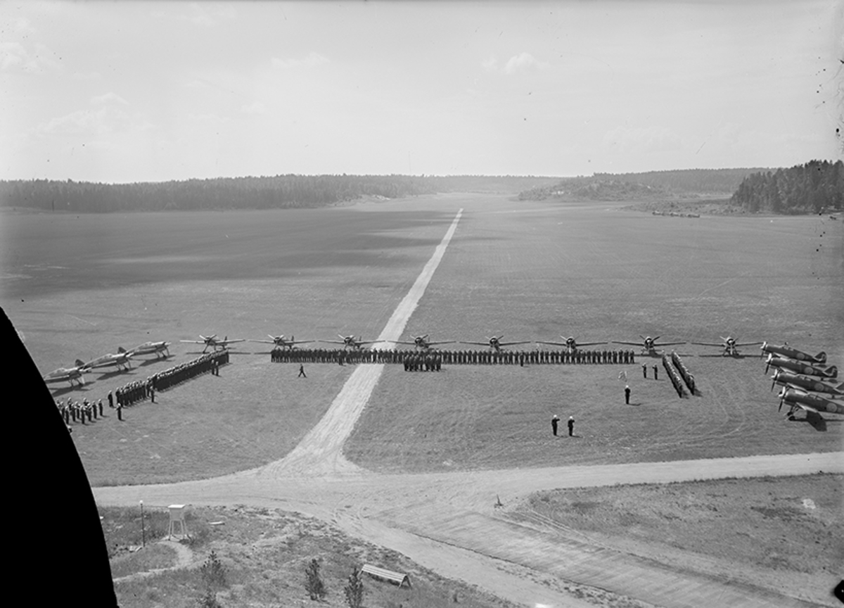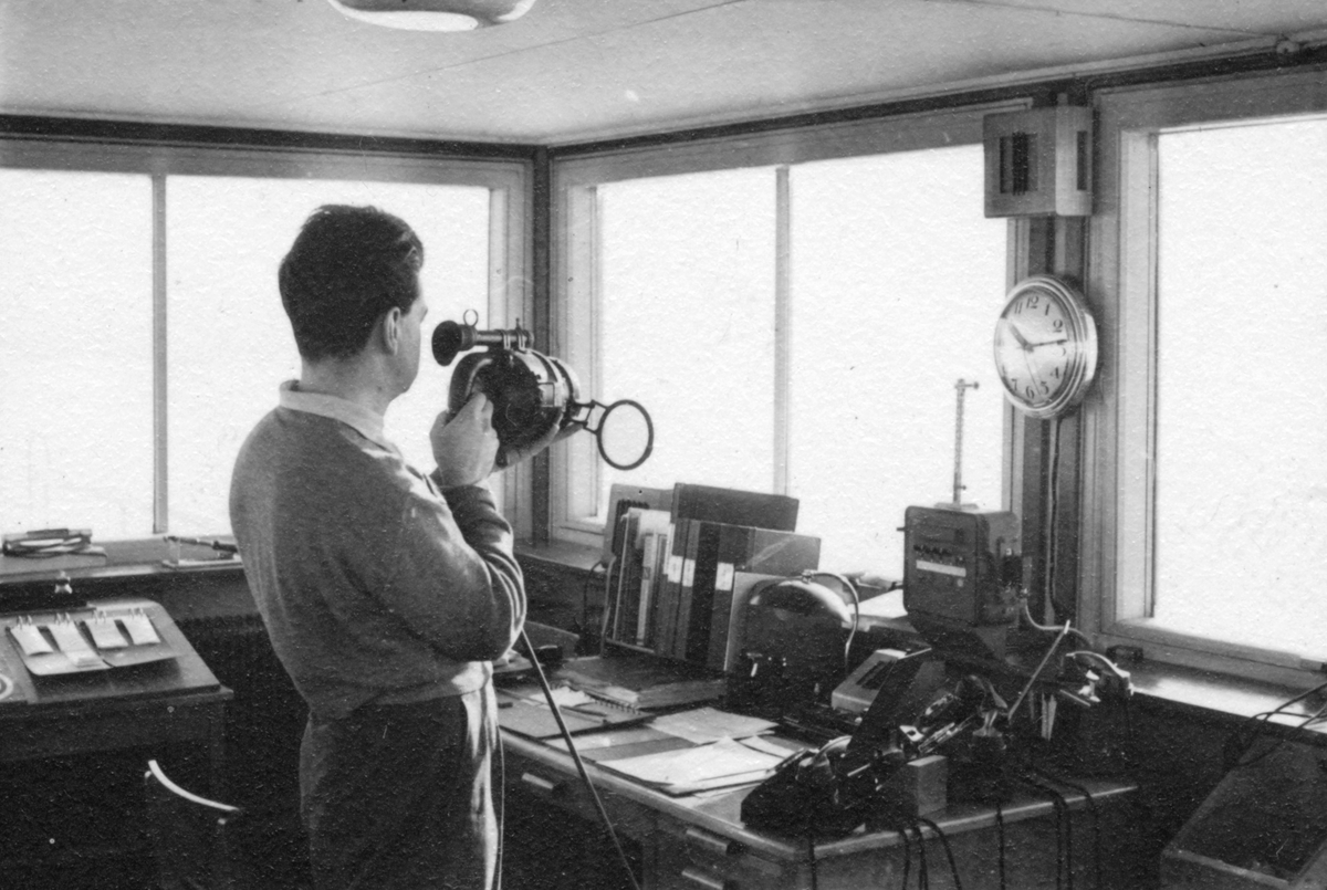 Signalering med signallampa för trafikledning. Trafikledare Erik Olsson i trafikledartornet på F 3 Östgöta flygflottilj, 1946.