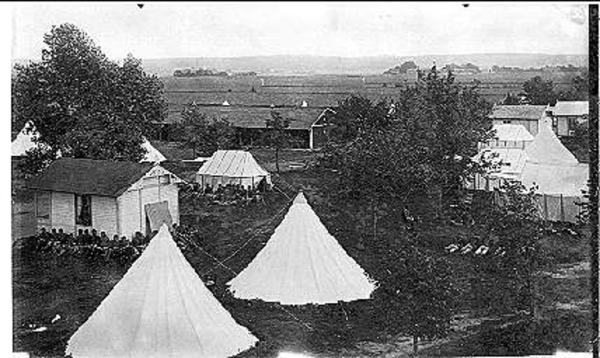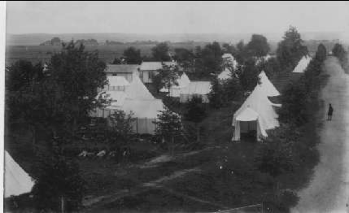 Lägret på Sanna hed fotograferat från nordväst 1894. I förgrunden officerstält och officersstugor. I mitten sekundchefstältet, bakom detta Skvadronsgatan, troppstält och skvadronsstallar.