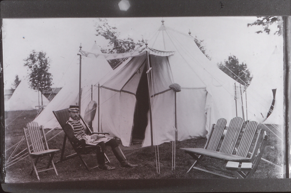 Livregementets husarer. Husarlägret på Sanna hed 1894. Prins Eugen utanför sitt tält. Han tjänstgjorde inte under hela sommaren, utan endast under mötena och hade ingen egen stuga.