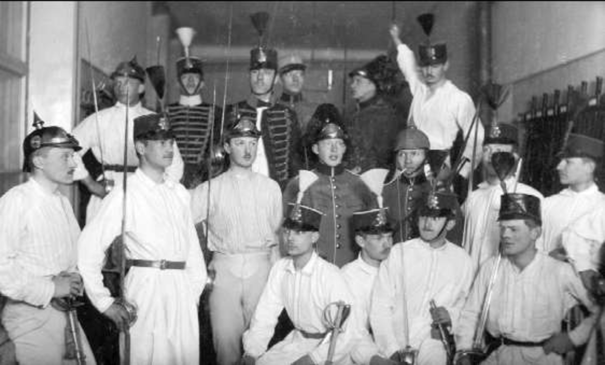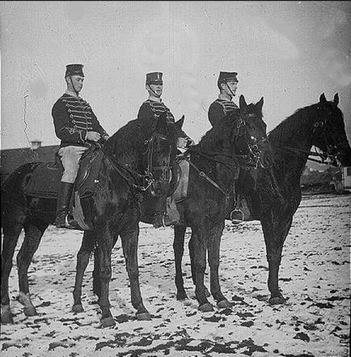 Kavalleriskolan 1905-06. Från vänster: Sittande Grill, Olsson, Ingelman, de Mare. Andra raden:Gleerup, Lindgren ,Wickström, Ekström, Edström. Tredje raden: Bagge, Ekberg, Åbron, Schnell, Falkenberg. Bakom: Mackstedt.