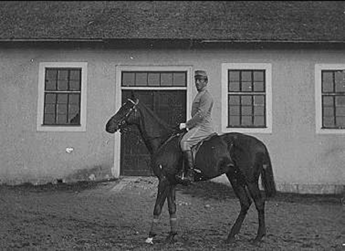Indelt husar till häst utanför Skvadronstallets långsida på K 3 i Skövde.