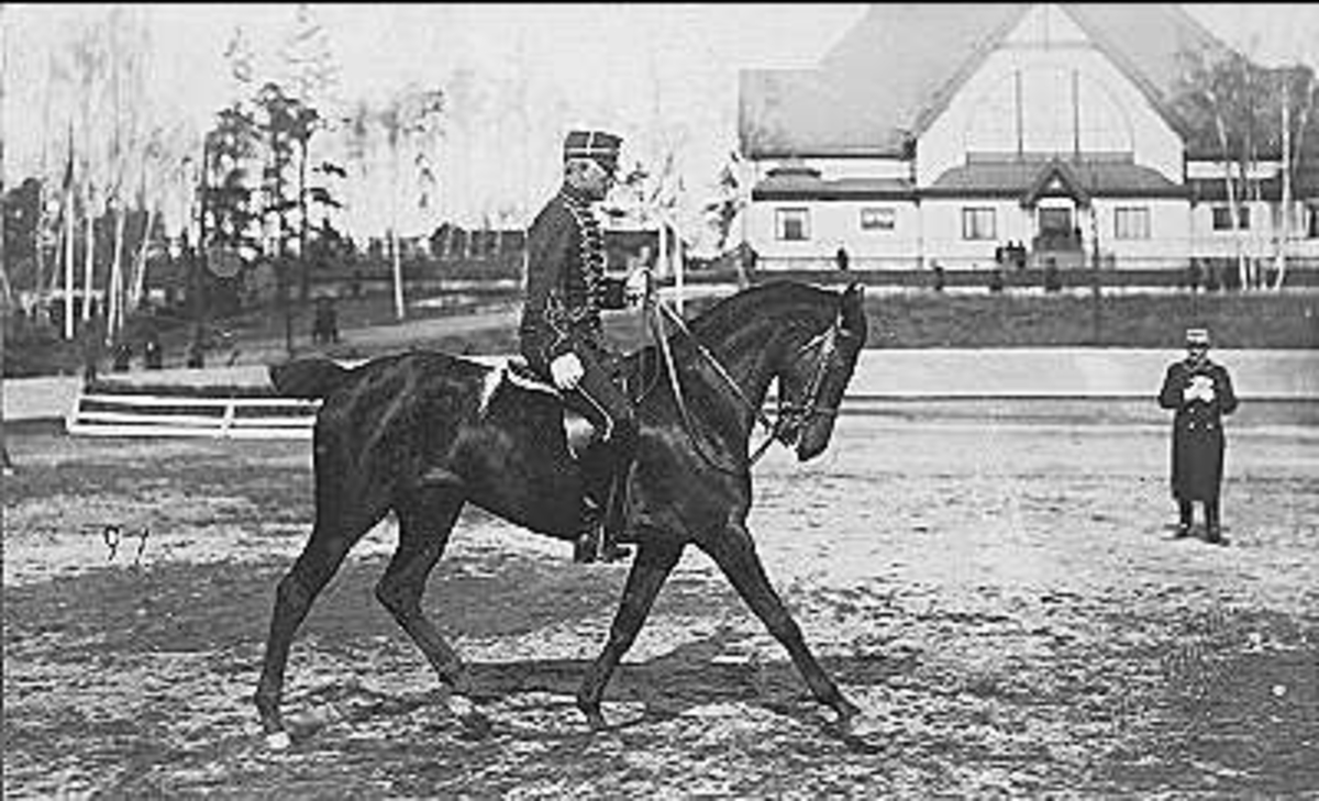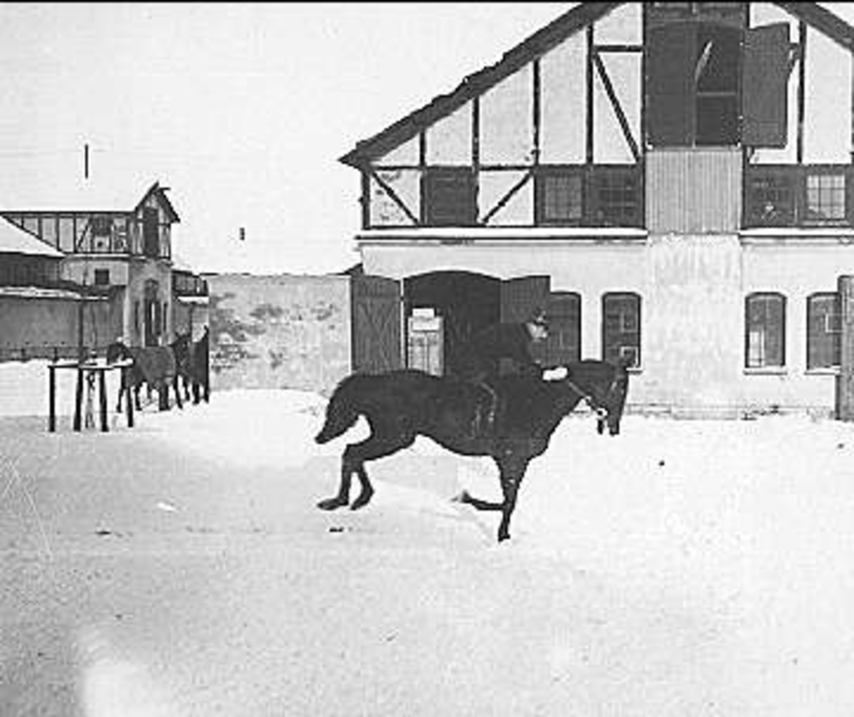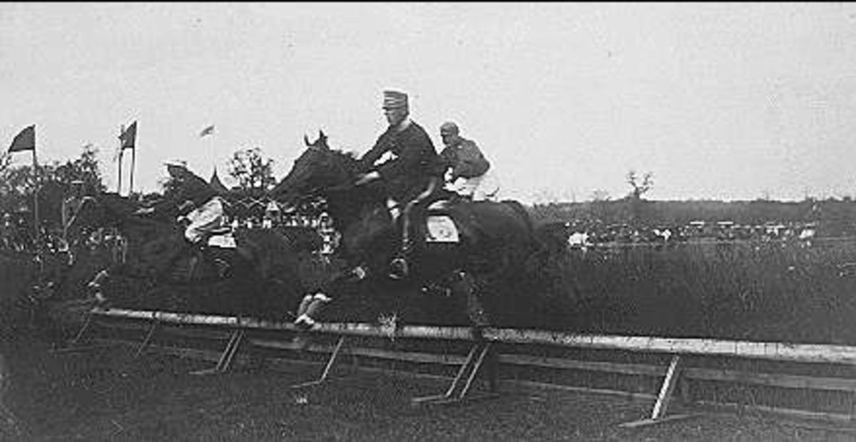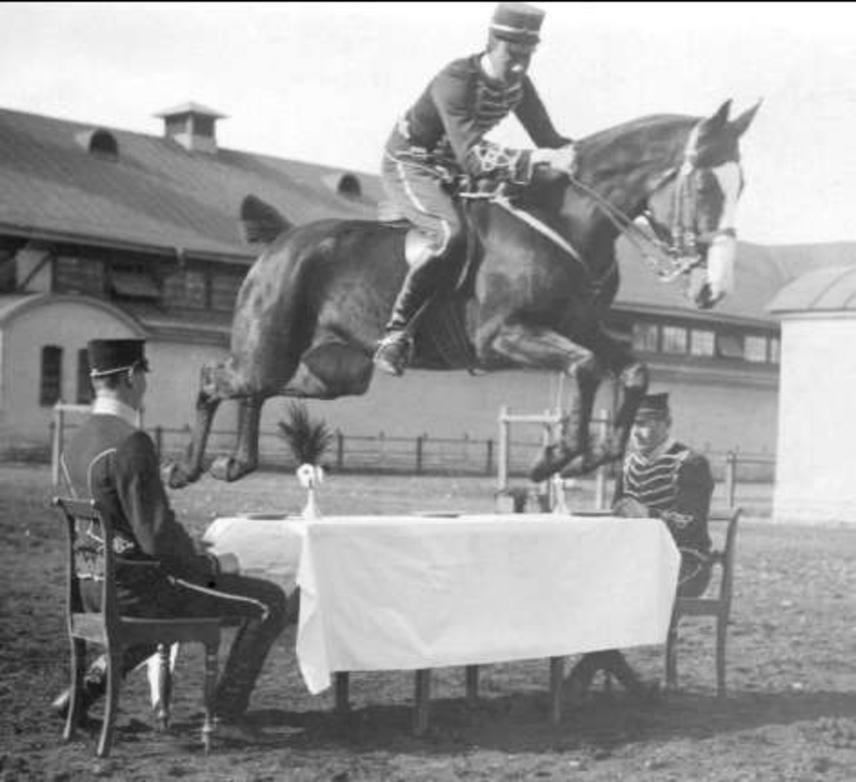 Henning Krafft övningshoppning/vänjningsövning på kaserngården K 3 i Skövde. Krafft blev senare en prishoppningsryttare i världsklass. Hedenstierna 1906-11. Kortet finns uppförstorat i entrén.