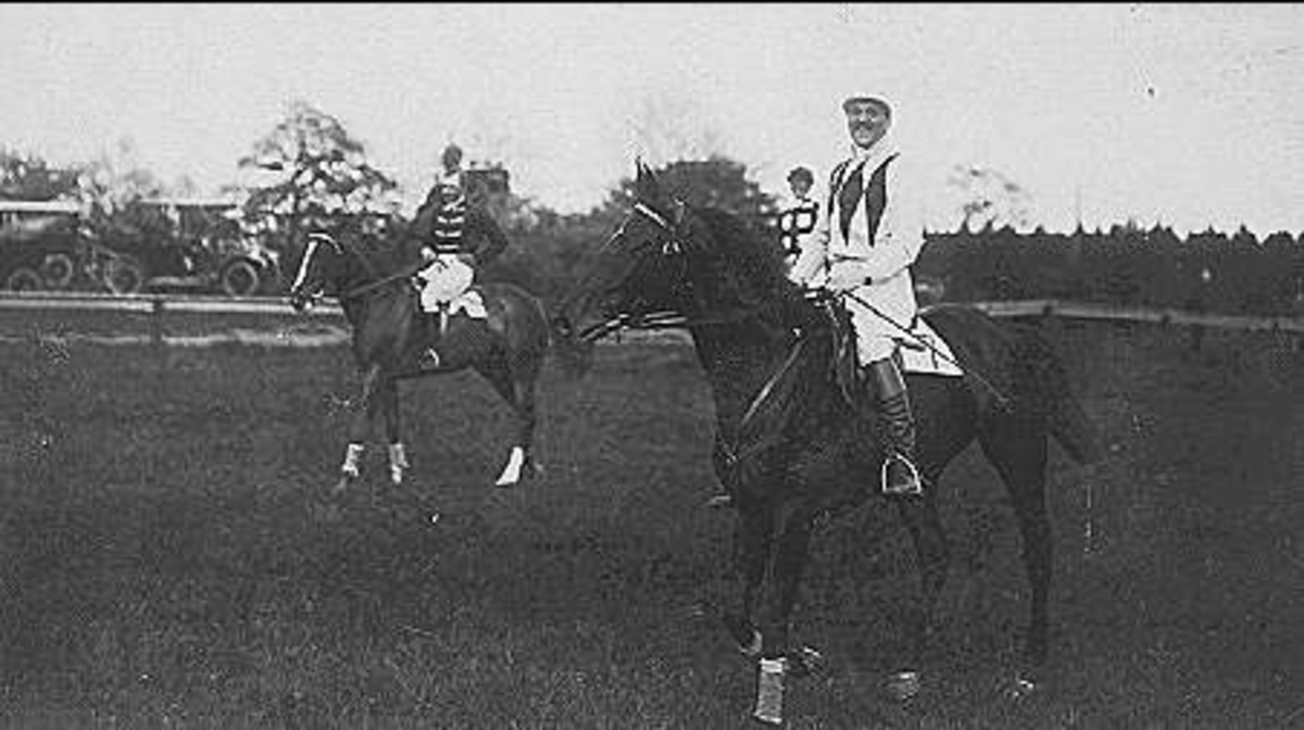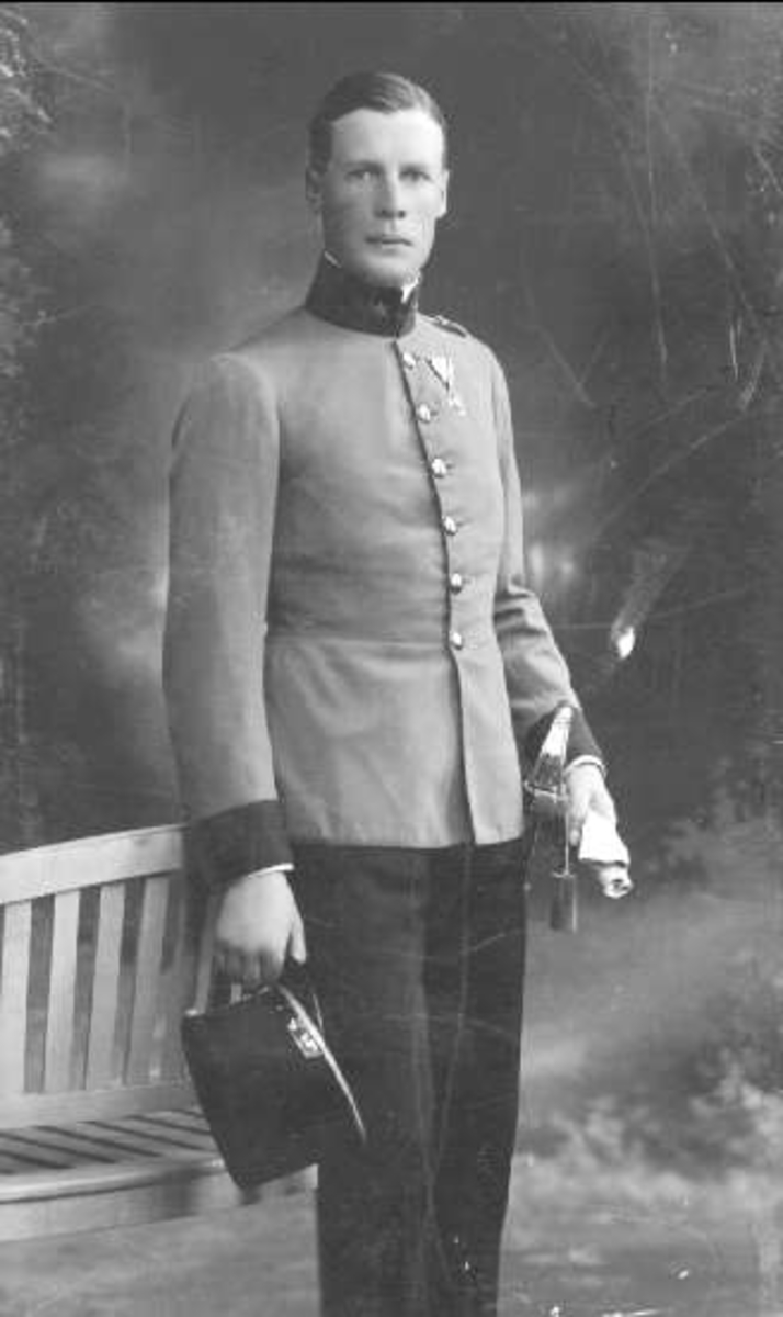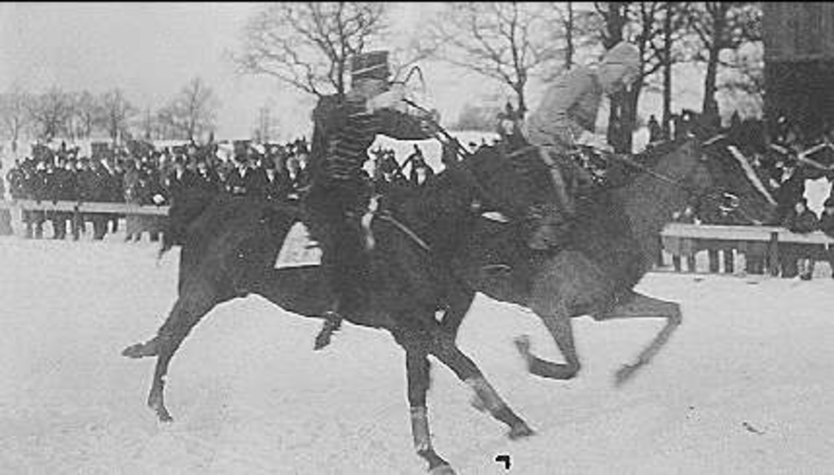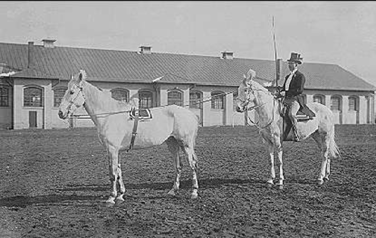 Henning Krafft övningshoppning/vänjningsövning på kaserngården K 3 i Skövde. Krafft blev senare en prishoppningsryttare i världsklass. Hedenstierna 1906-11. Kortet finns uppförstorat i entrén.