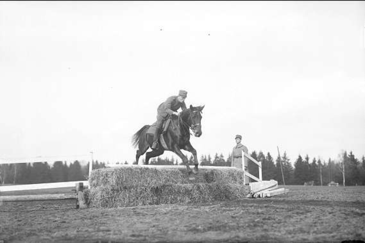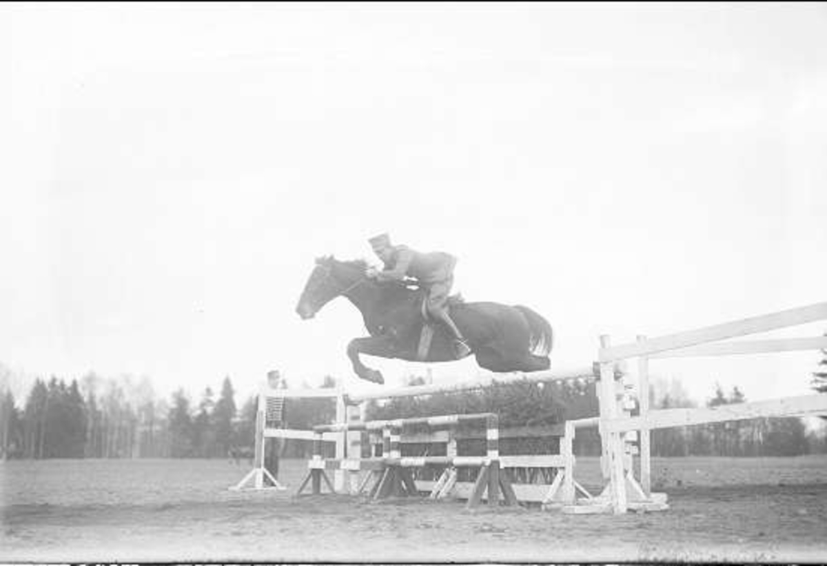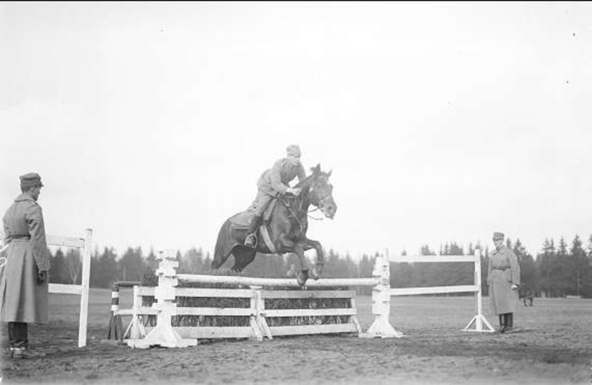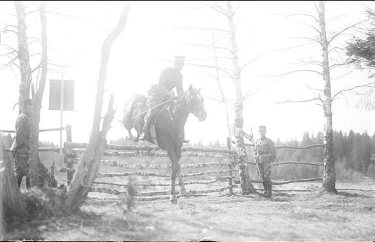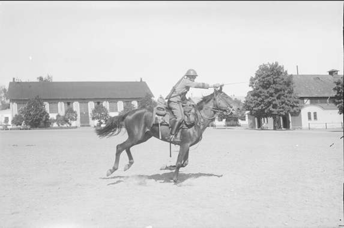 Sabelfäktning till häst på K 3 kaserngård. Ryttaren i uniform m/1910, hästen i full fältutrustning.