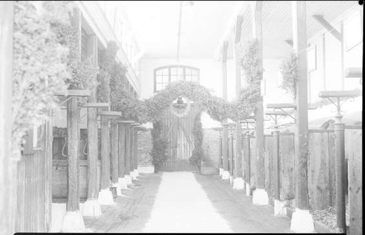 Skövde fältrittklubbs tävlingar 1932. Dressyrtävling på sandbanan öster om ridhuset. I bakgrunden järnpaddocken.