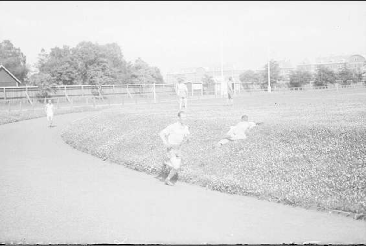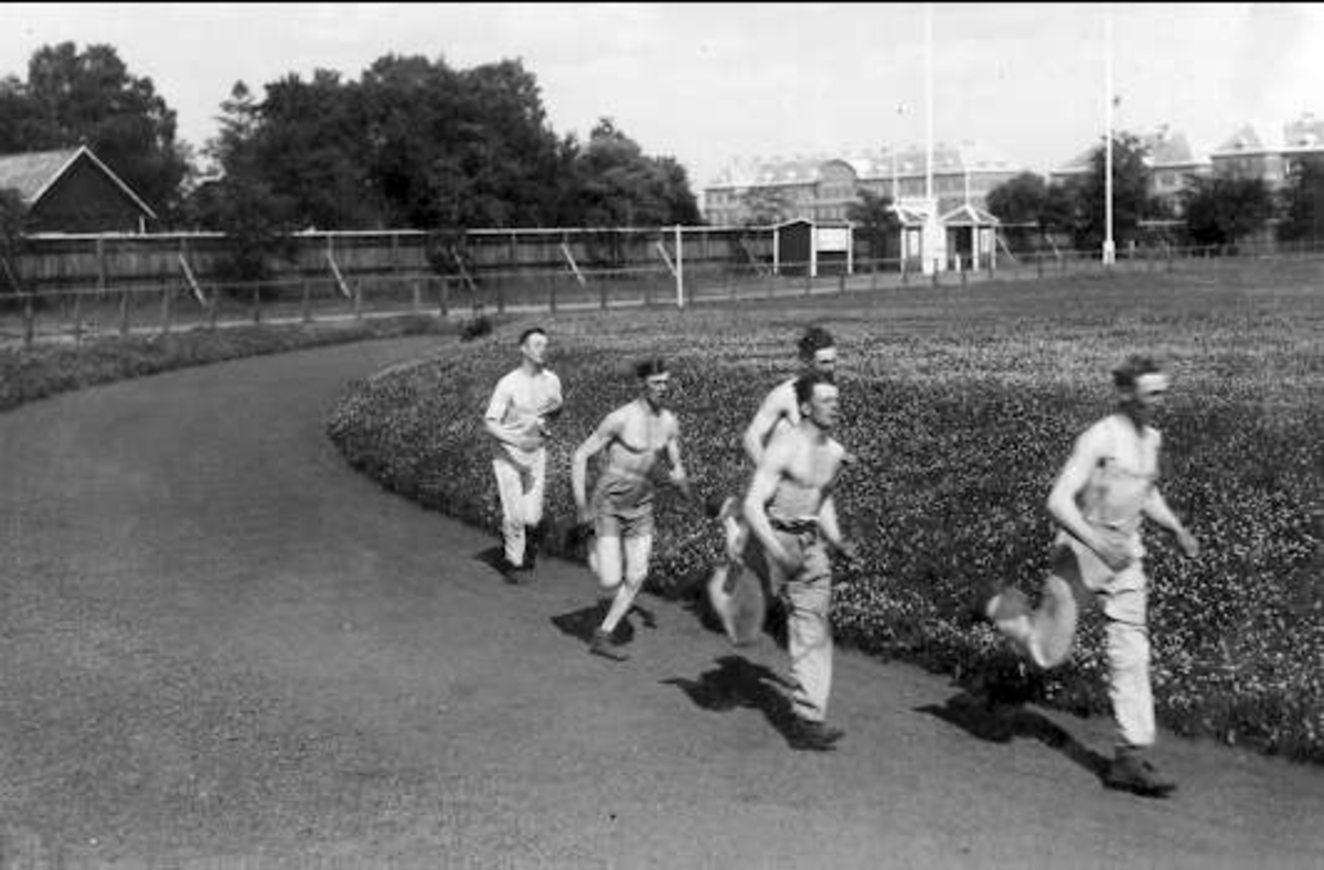 Banhoppning på fältet söder K 3 kasern off.asp i m/23, vpl i m/1895. De gamla uniformerna användes långt efter det att ny modell fastställts. Modell 1895 användes ända fram till 1940-talet. (exempelvis en volont&a