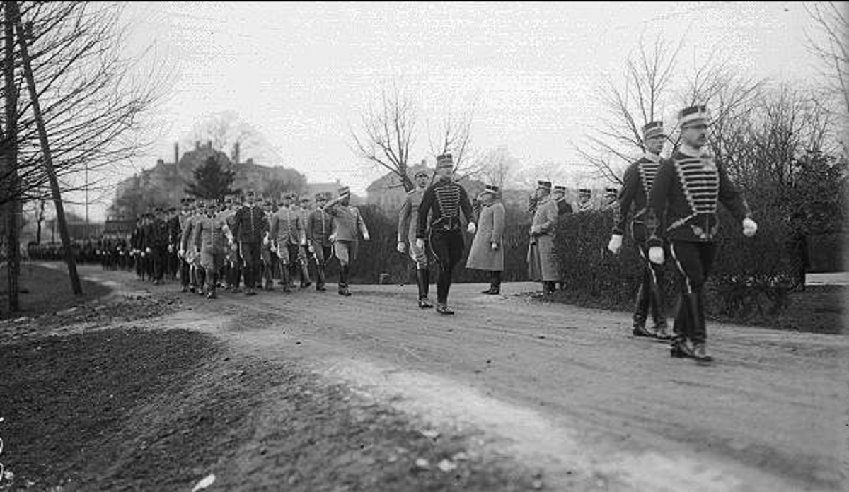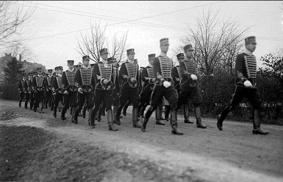 Marsch till kasern från soldathemmet efter högtidlighållandet av 4 dec.