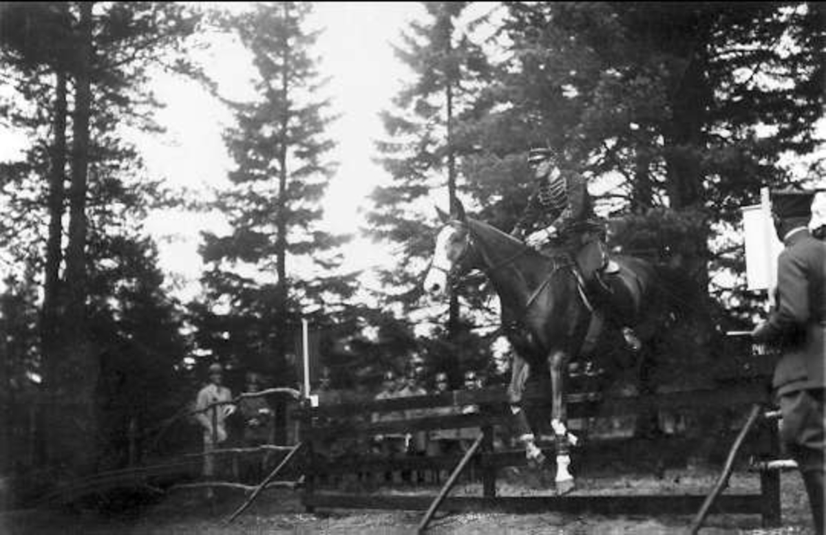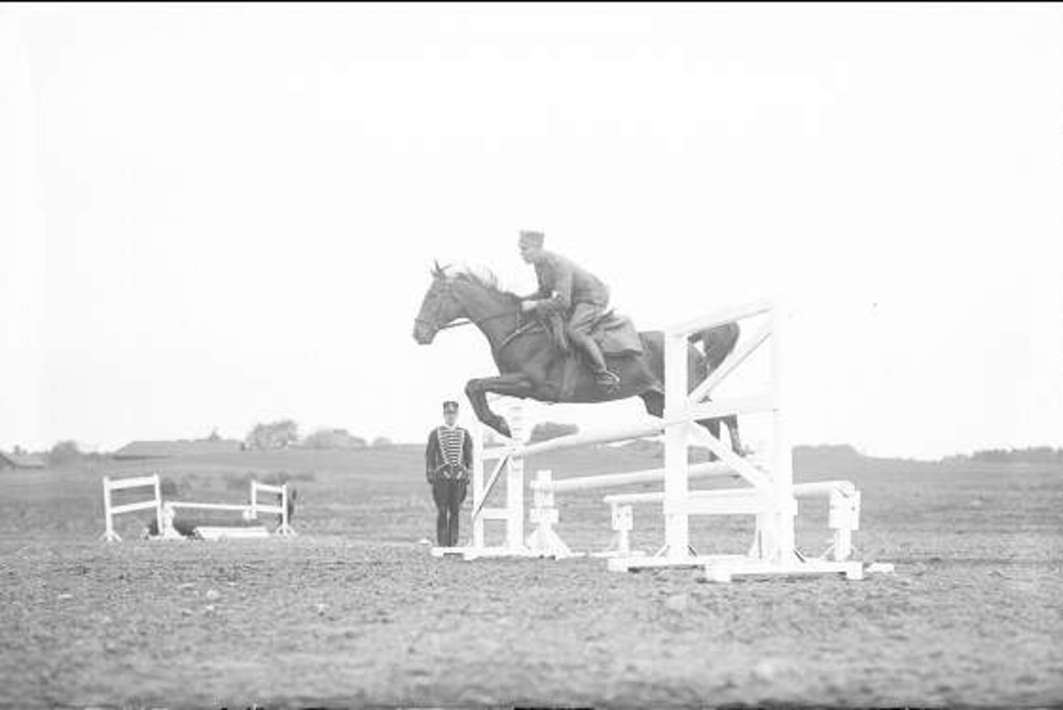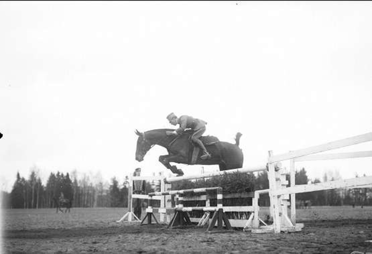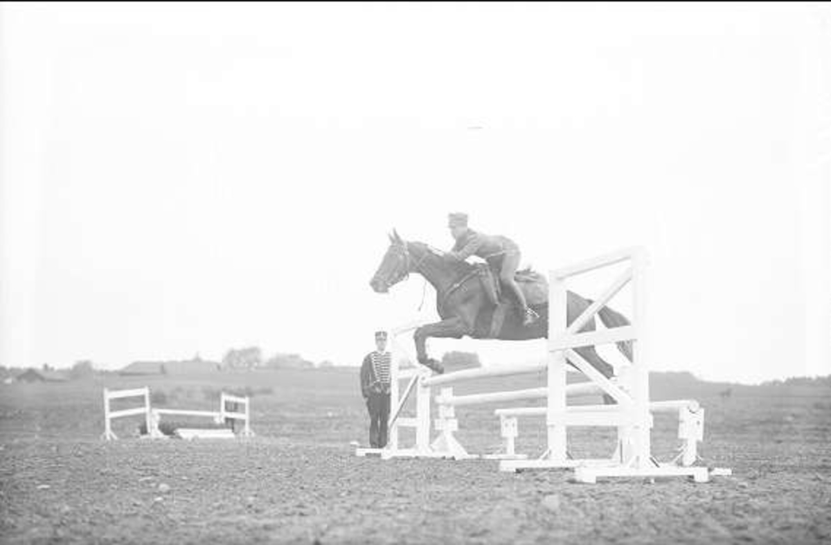 Regementskapplöpningarna 1932 på fältet söder K 3 kasern. Furirjaktlopp över jordvallen med häck.