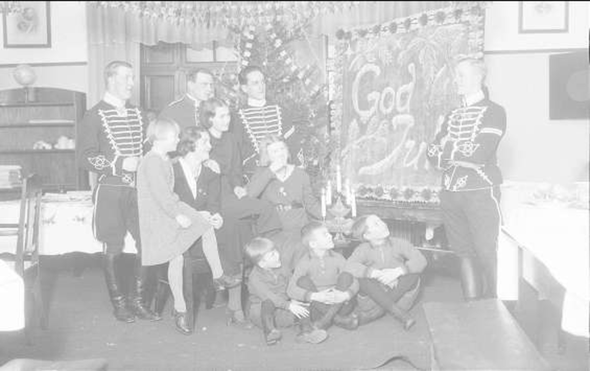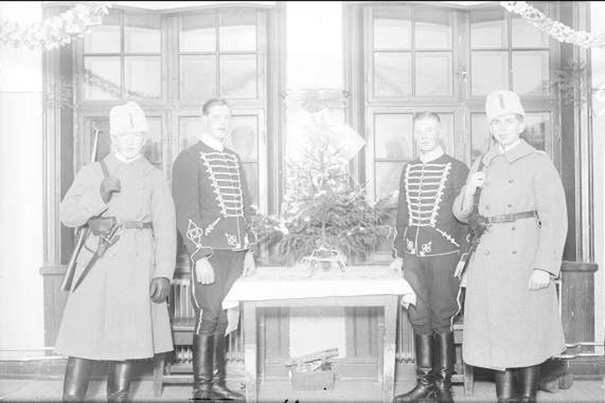 Personerna antagligen stallpersonal; en stallfurir och tre hästskötare, varav en hästskötare från annat förband. Klädsel m/10 och m/ä.