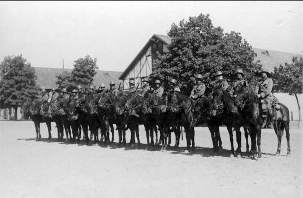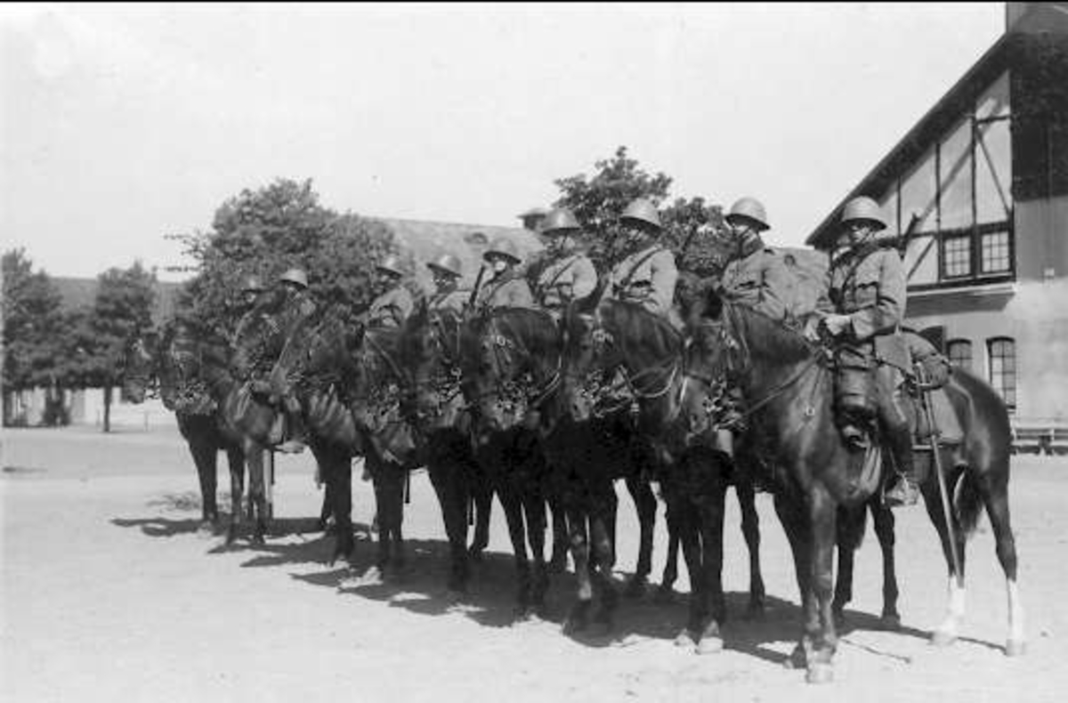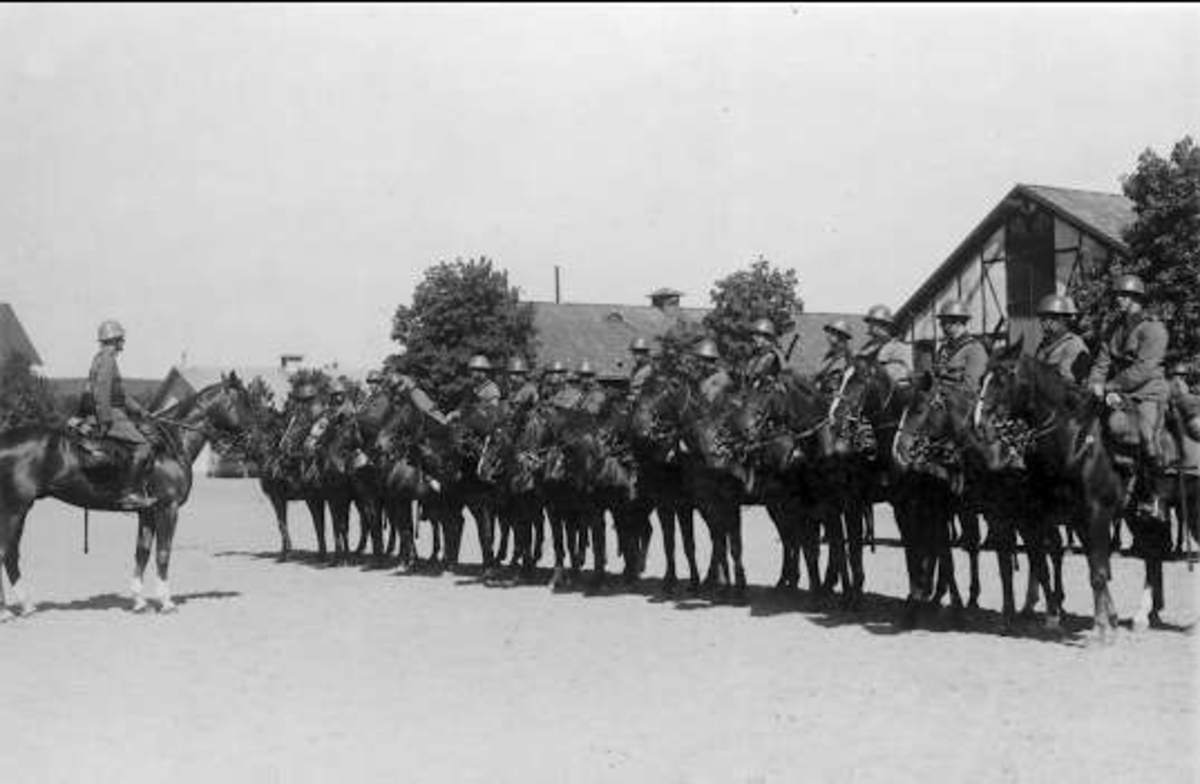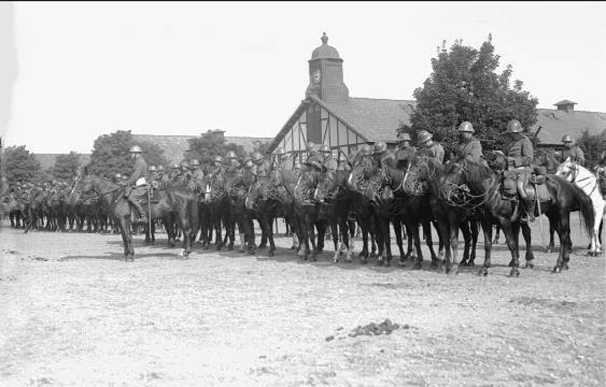Regementet till häst uppställt på kaserngården söder om stallarna för avlämning före avmarsch till fälttjänstgöring under sommarmarschen 1932.