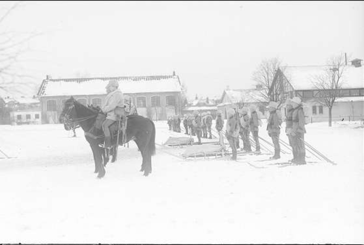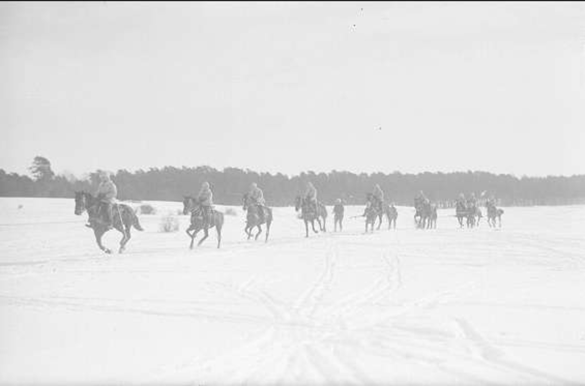 Ryttarpluton ur 4. skv vinterorganiserad. Plutonchefen på skidor, plutch stf. till häst. Två skidlöpare tolkar efter varje häst. Vissa hästar drar pulka med tunga vapen efter vilken en skidlöpare tolkade för att k