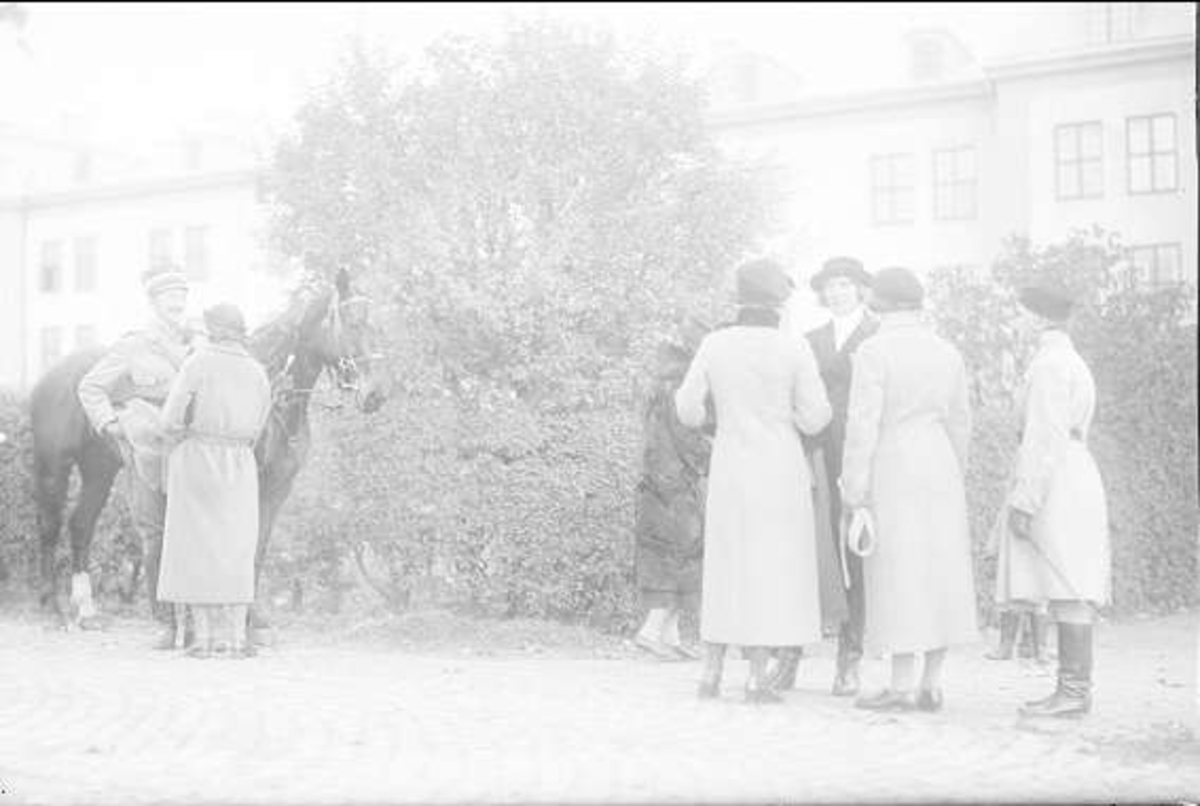 Halali söder K 3 kasern. Vissa officersfruar red med i jaktritten på makens tjänstehäst, vissa mötte upp vid halali.