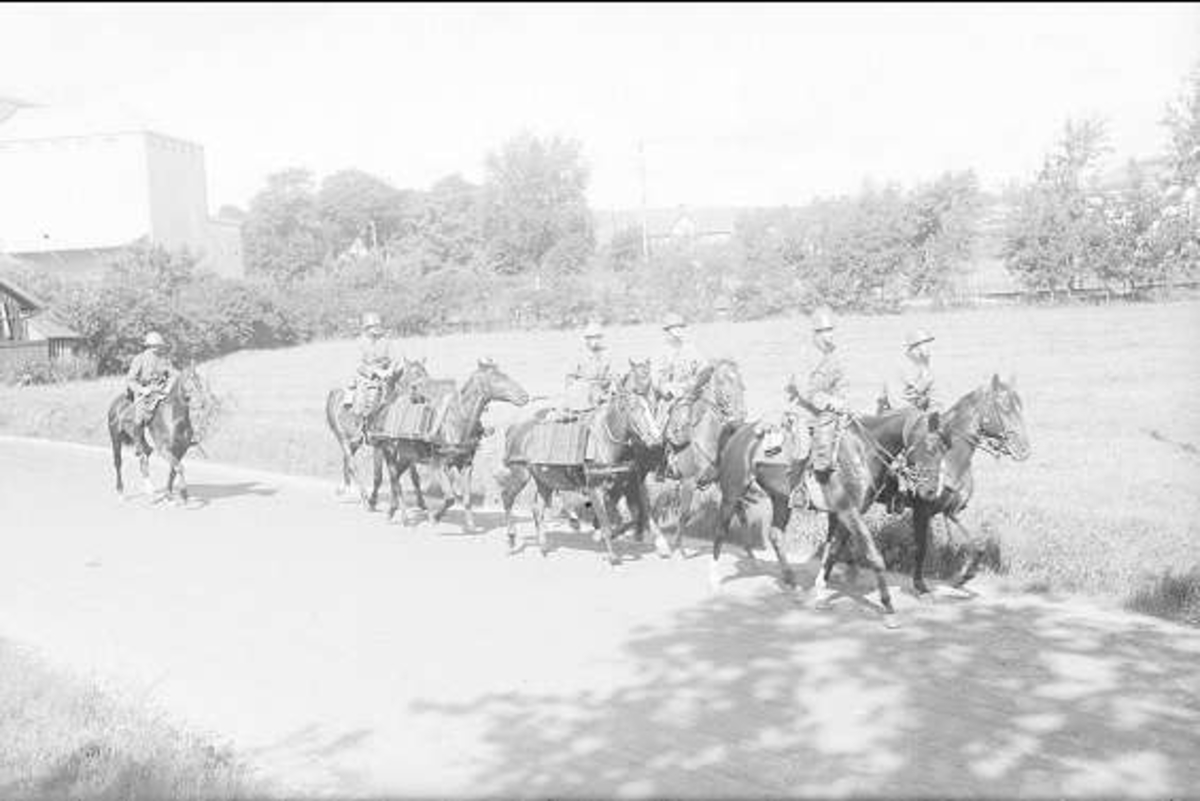 Klövjad granatkastartropp på väg ut på sommarmarsch. Troppchef löjtn. Sven Littorin. Skimmeln är nr 69/2 Pavo- en av regementets bästa stamhästar på 1930-talet.