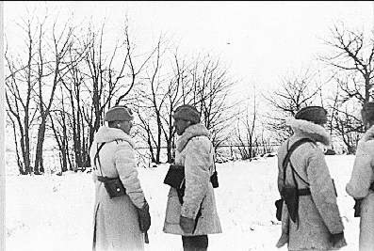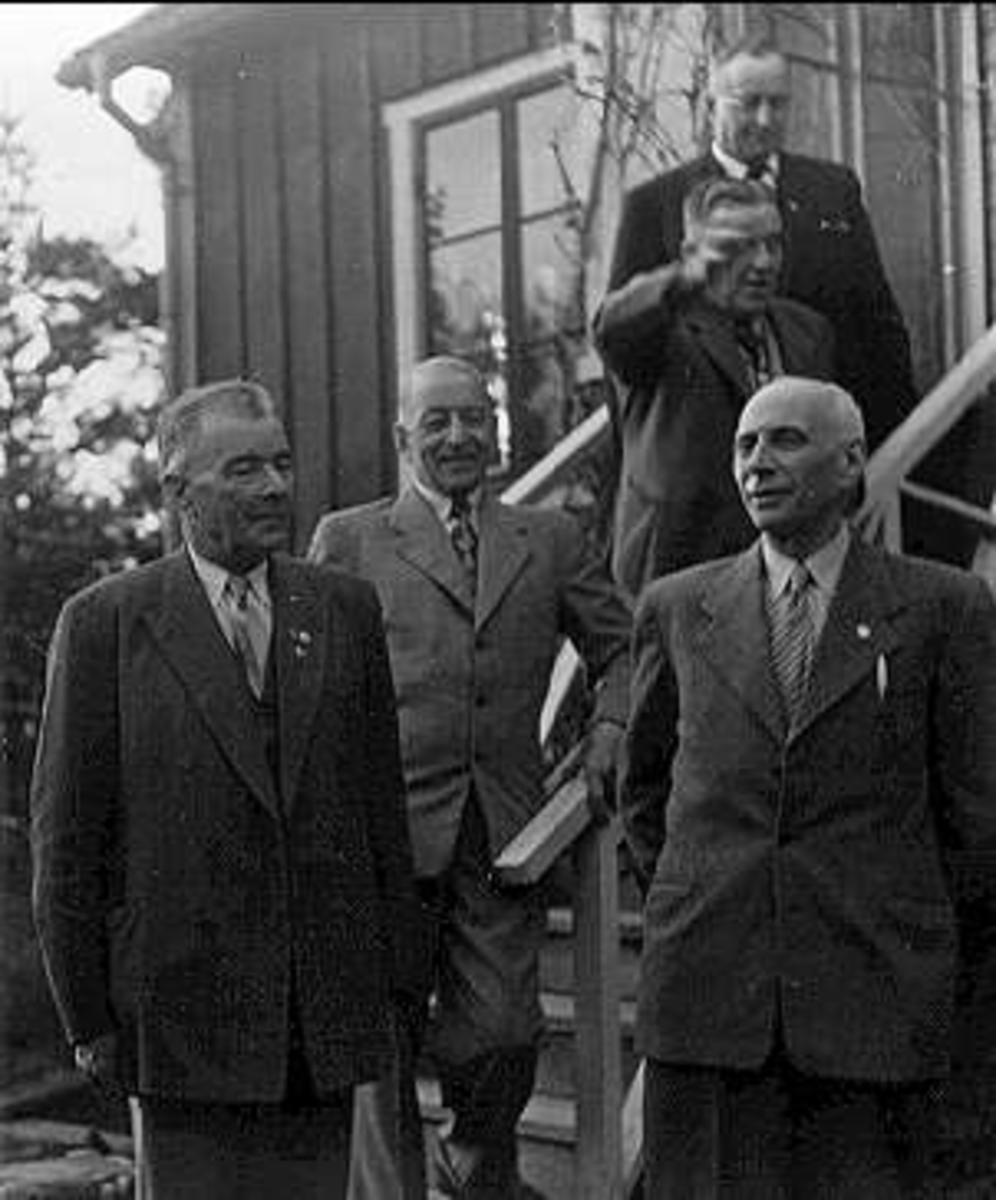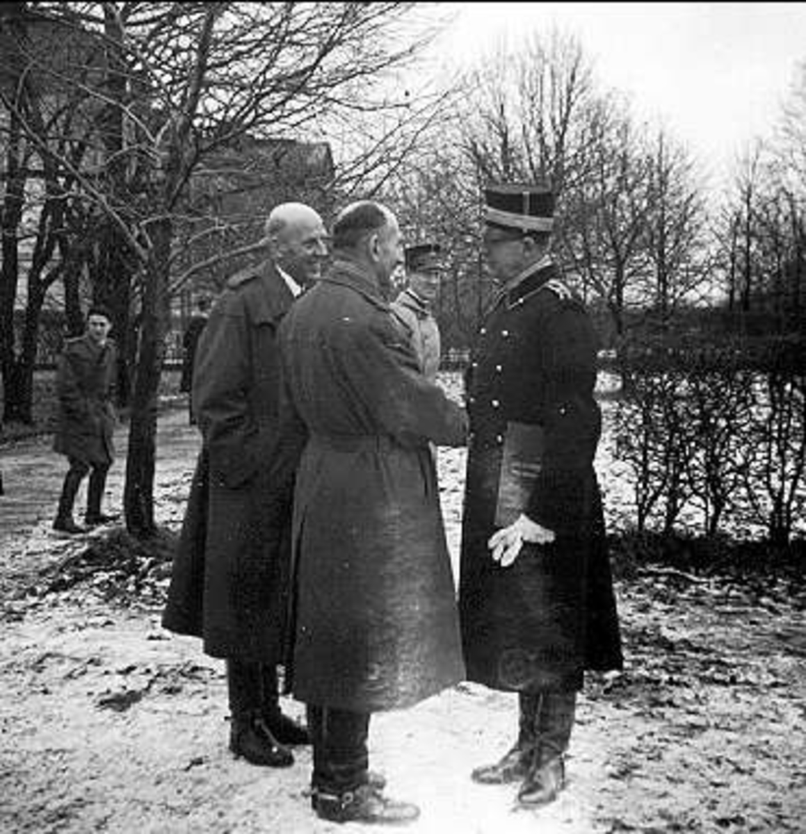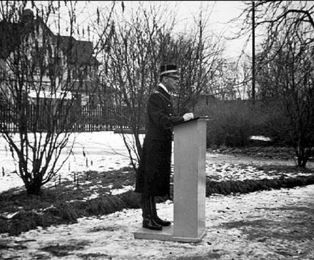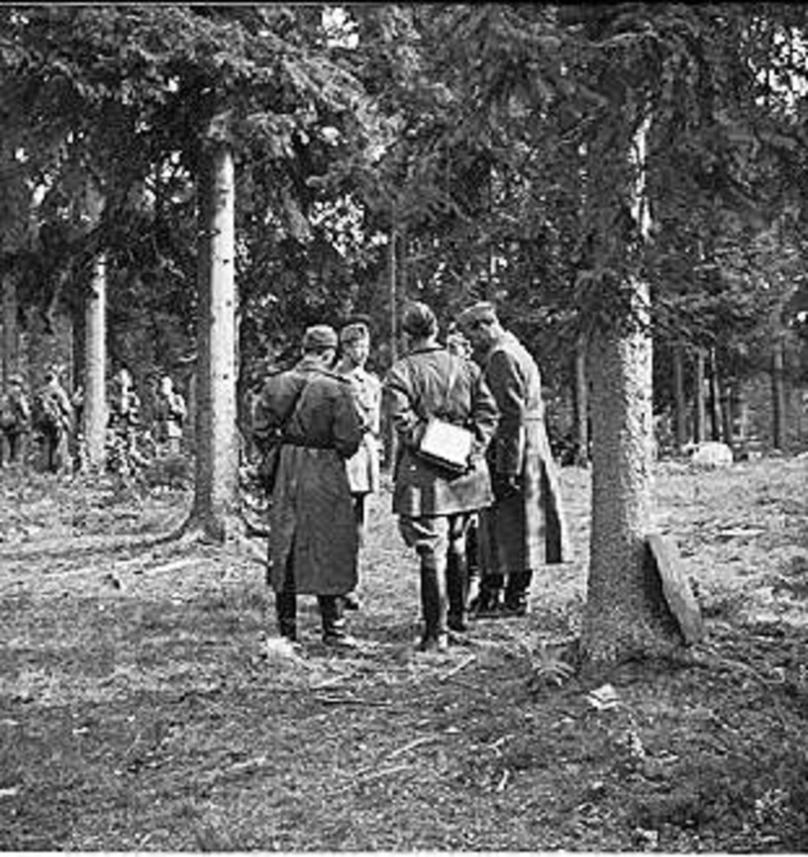 Livskv minnessten vid Fellingsbro avtäckes. I främre raden från vänster: major Afzelius, major H Ling-Vannerus, överste E Flodström, överste G Bergenstråhle och major Sven Littorin.