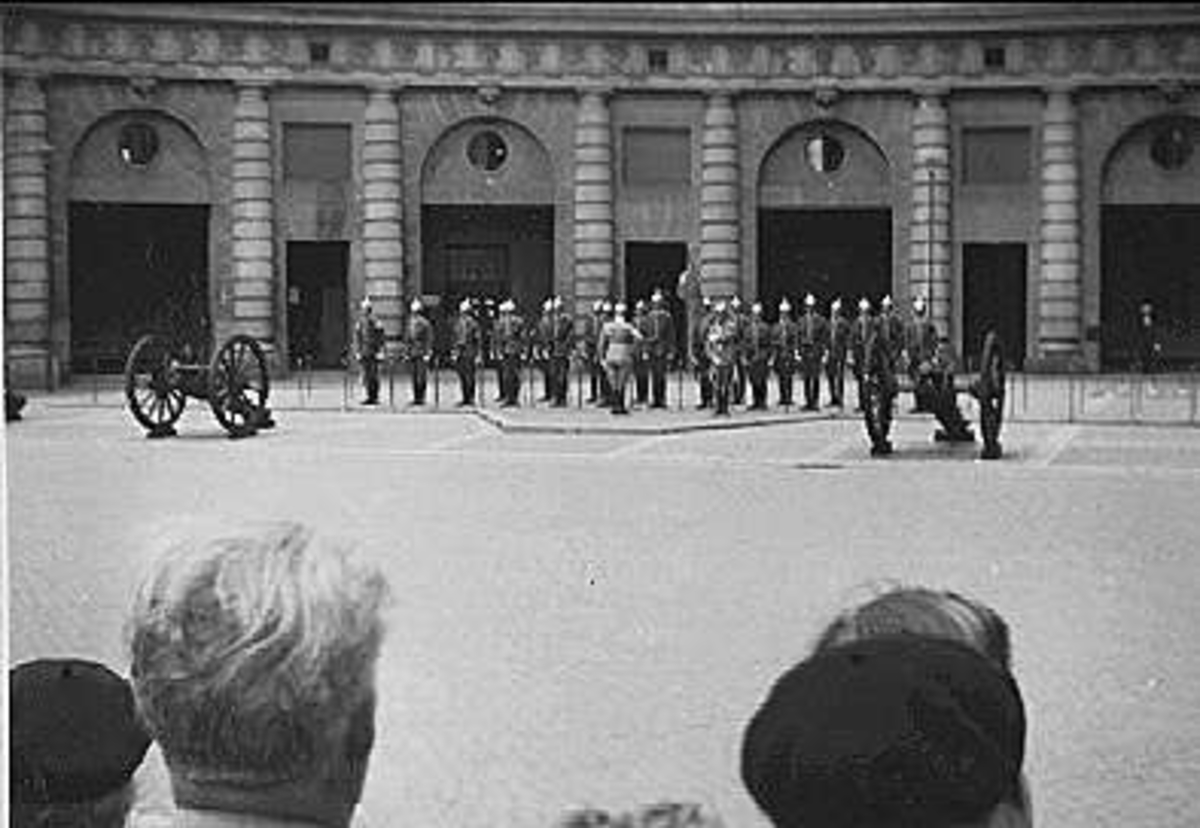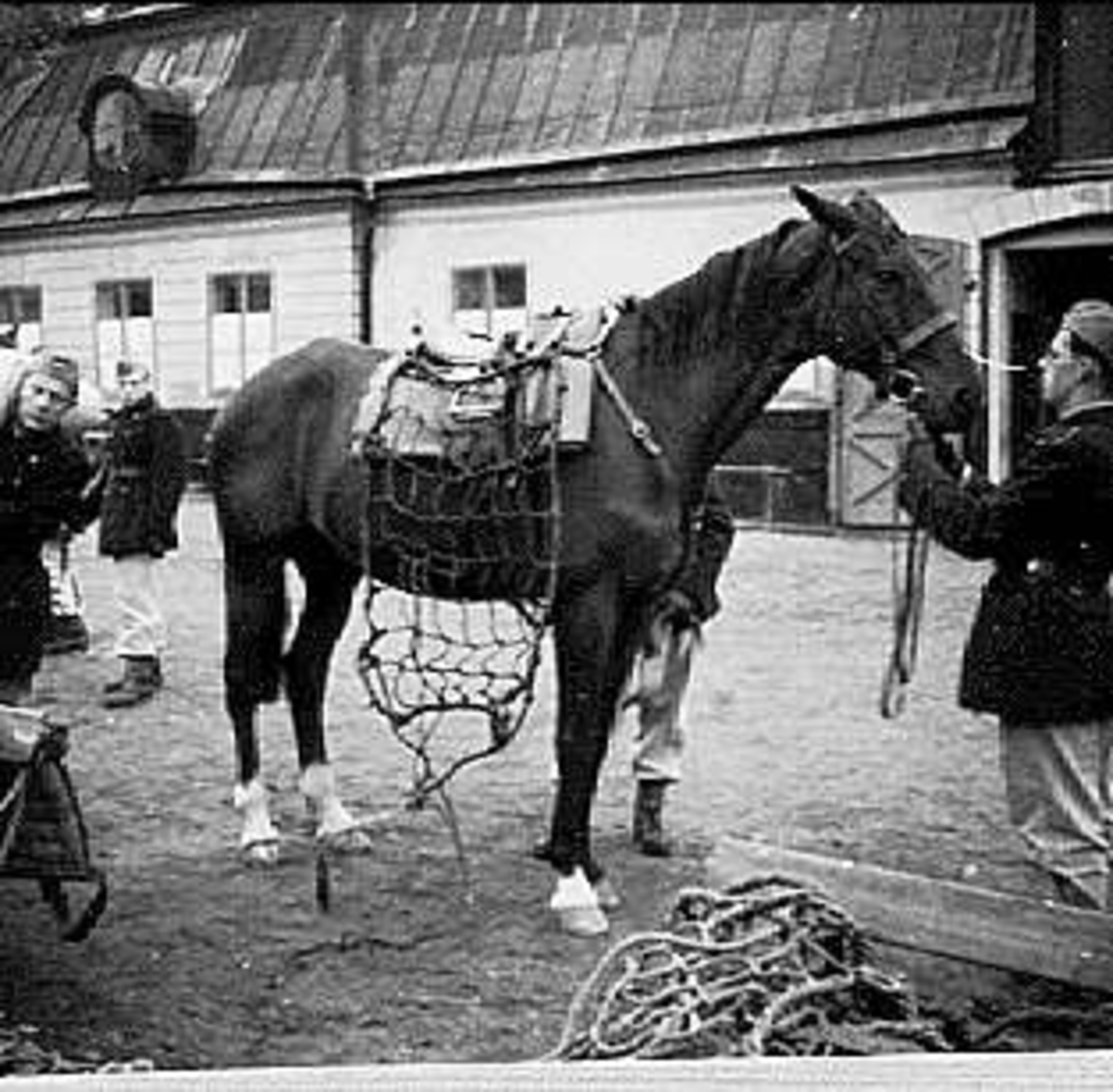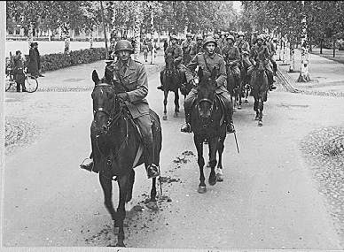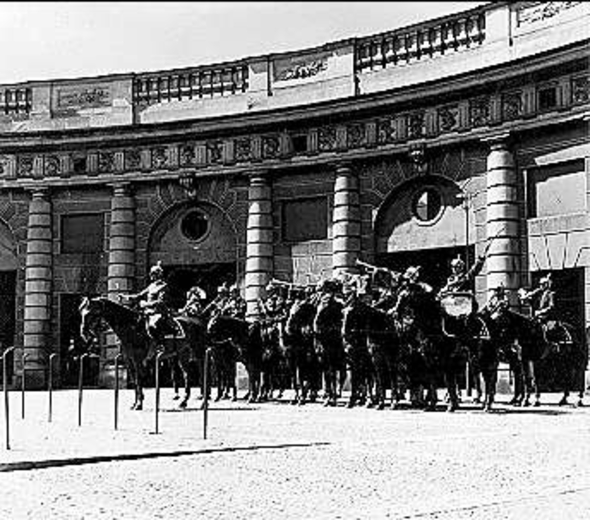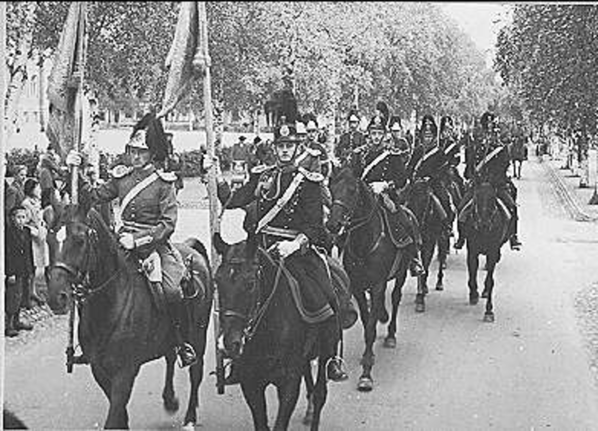 Standar och standarvakt beridna på enbart vita hästar i samband med avtäckande av livskvadronens minnessten vid Fellingsbro 6 juni 1948. Deputationer från grenadjärerna och husarerna deltog, Fellingsbros manskör sjöng