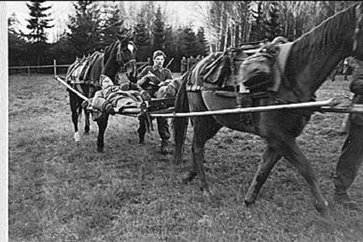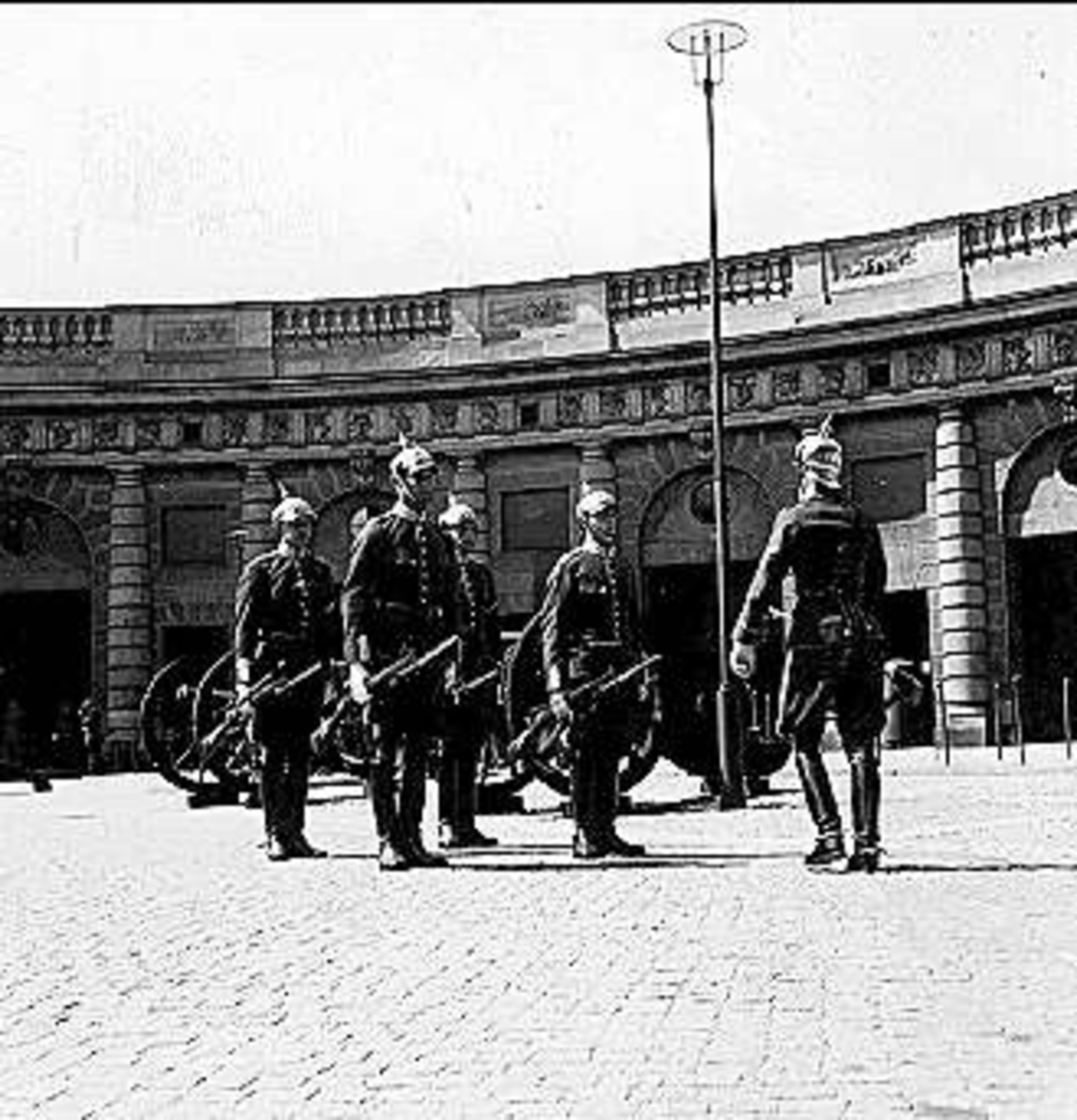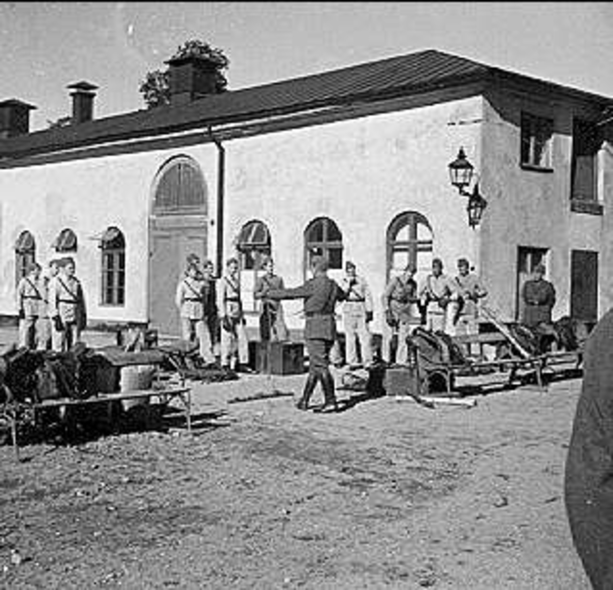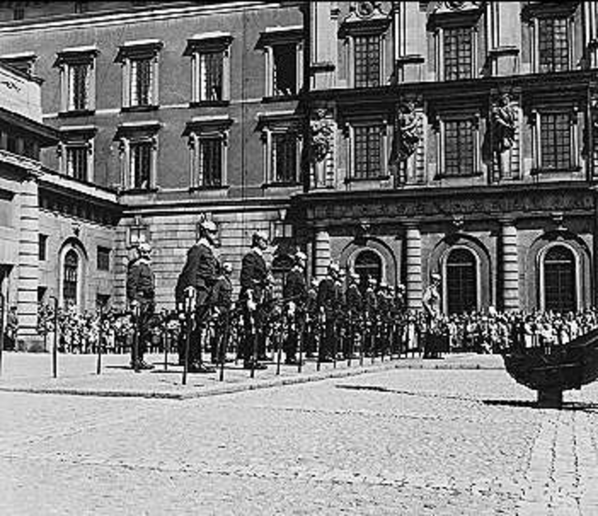 Standar och standarvakt beridna på enbart vita hästar i samband med avtäckande av livskvadronens minnessten vid Fellingsbro 6 juni 1948. Deputationer från grenadjärerna och husarerna deltog, Fellingsbros manskör sjöng