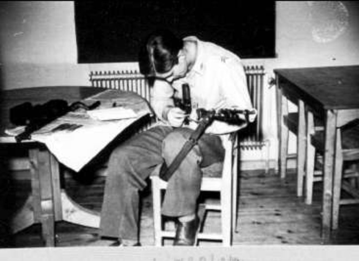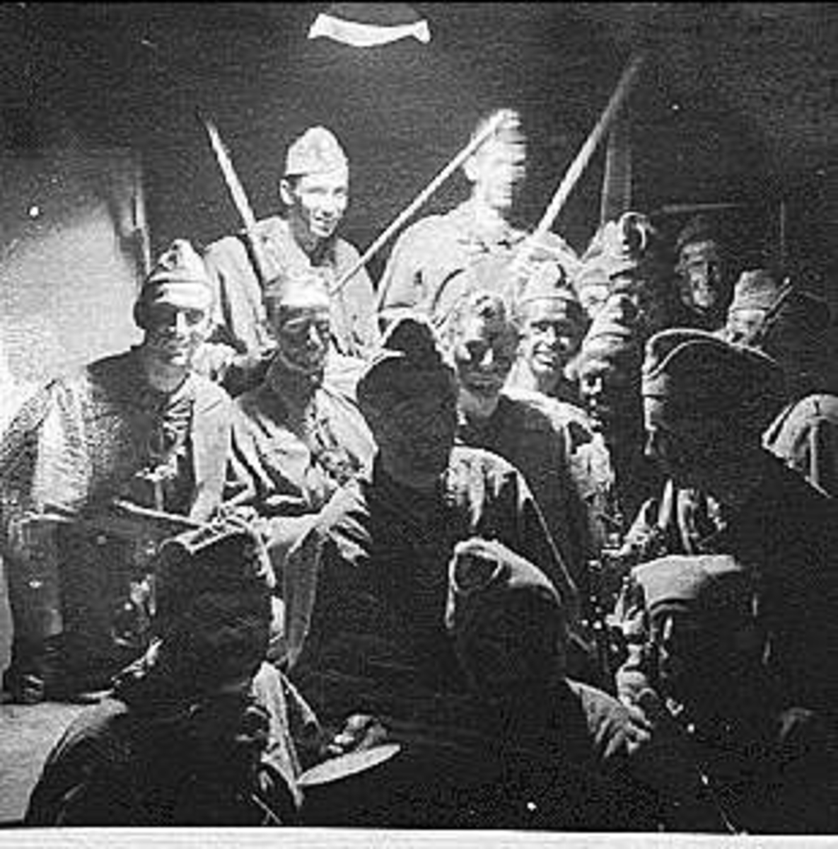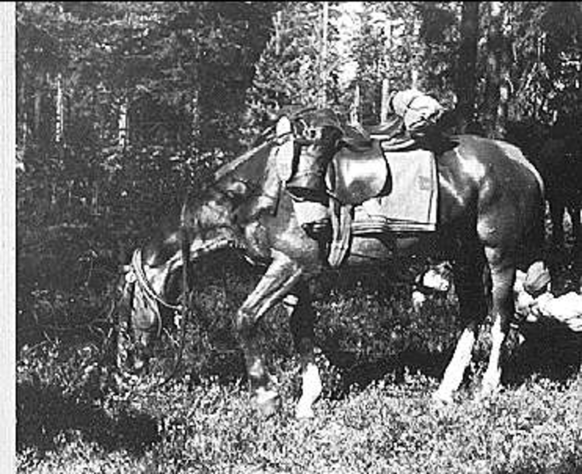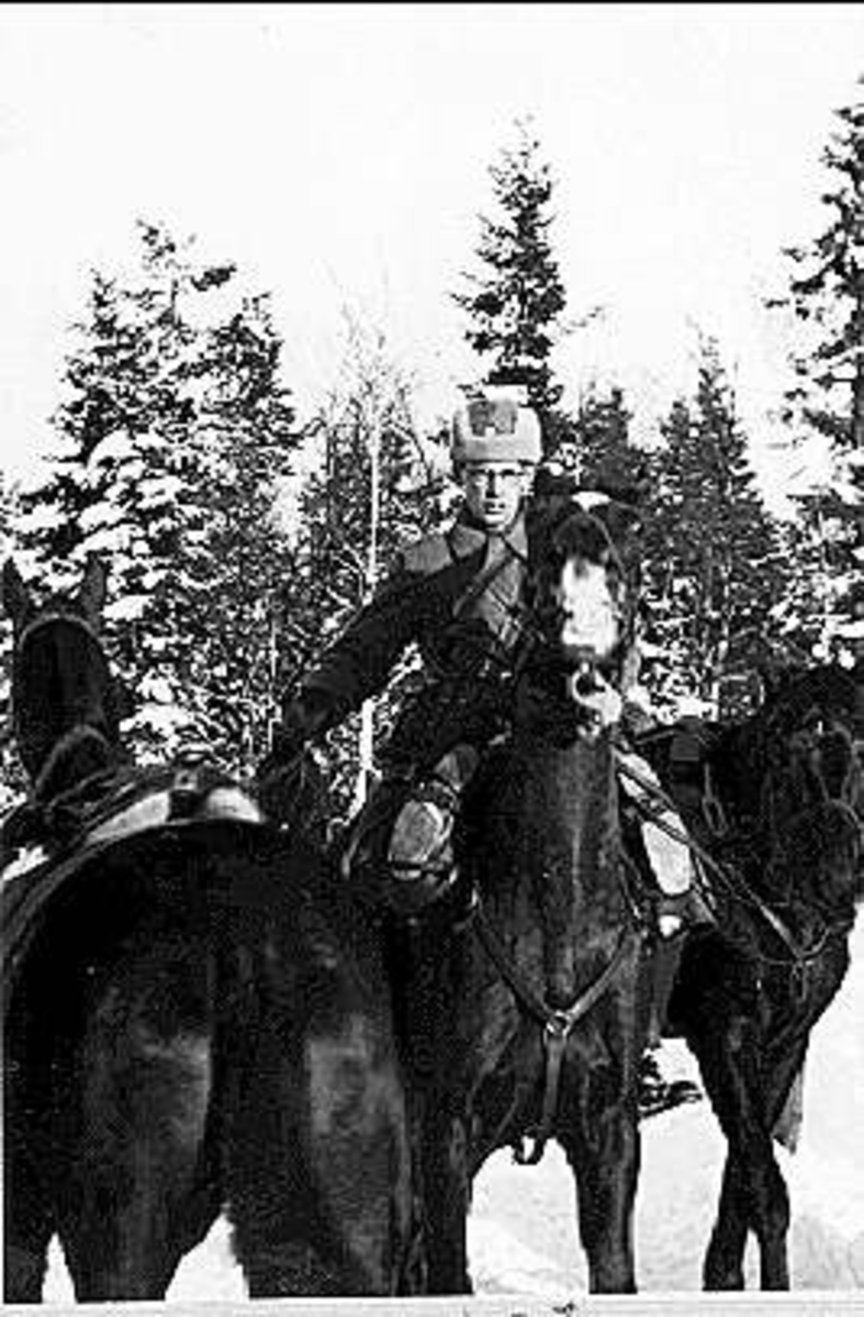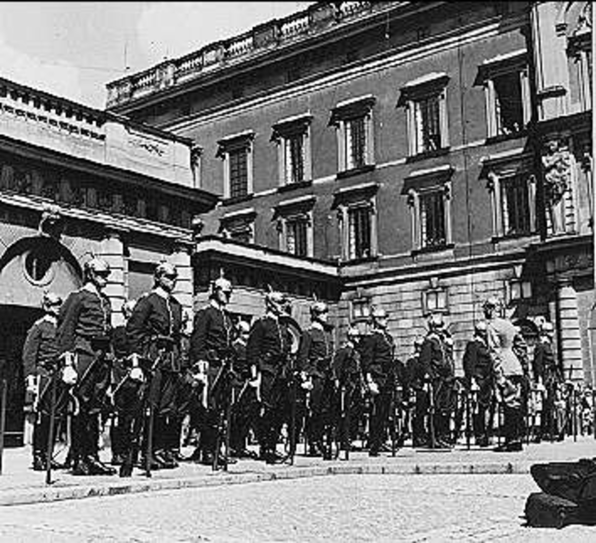 Standar och standarvakt beridna på enbart vita hästar i samband med avtäckande av livskvadronens minnessten vid Fellingsbro 6 juni 1948. Deputationer från grenadjärerna och husarerna deltog, Fellingsbros manskör sjöng