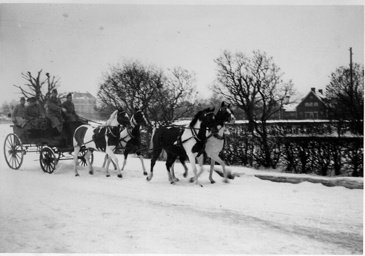 Ridkurs 12/10 1954-13/5 1955 Strömsholm.Övningar och tävlingar i Boden.Ryttmästare Nils Ankarcrona vid K4 kasern.Deltagare från Livregementets husarer, K3:Fänrik Westergren, överfurir Fridolfsson och sergeant Ewert Olau