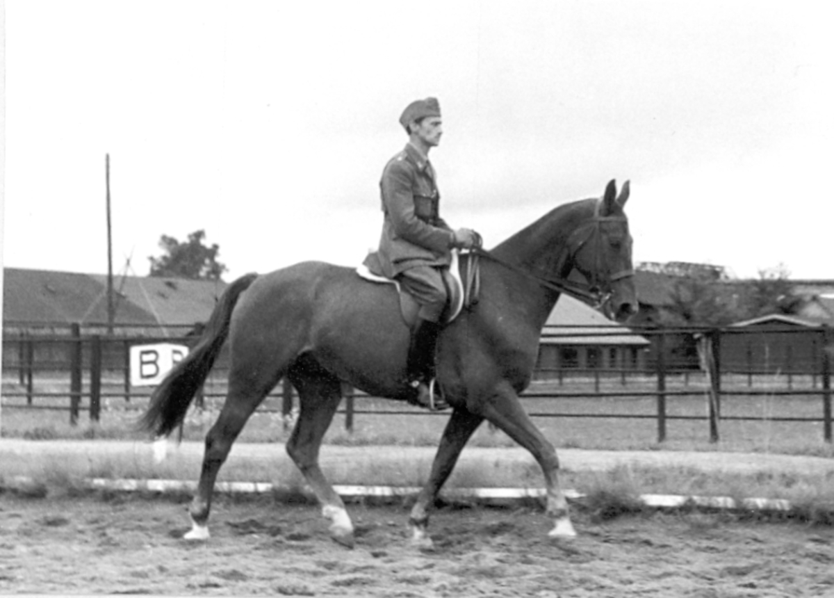 Ridkurs 12/10 1954-13/5 1955 Strömsholm.Tjänstehästen "Tivoli", valack född 1949.Deltagare från Livregementets husarer, K3:Fänrik Westergren, överfurir Fridolfsson och sergeant Ewert Olausson.Förteckning