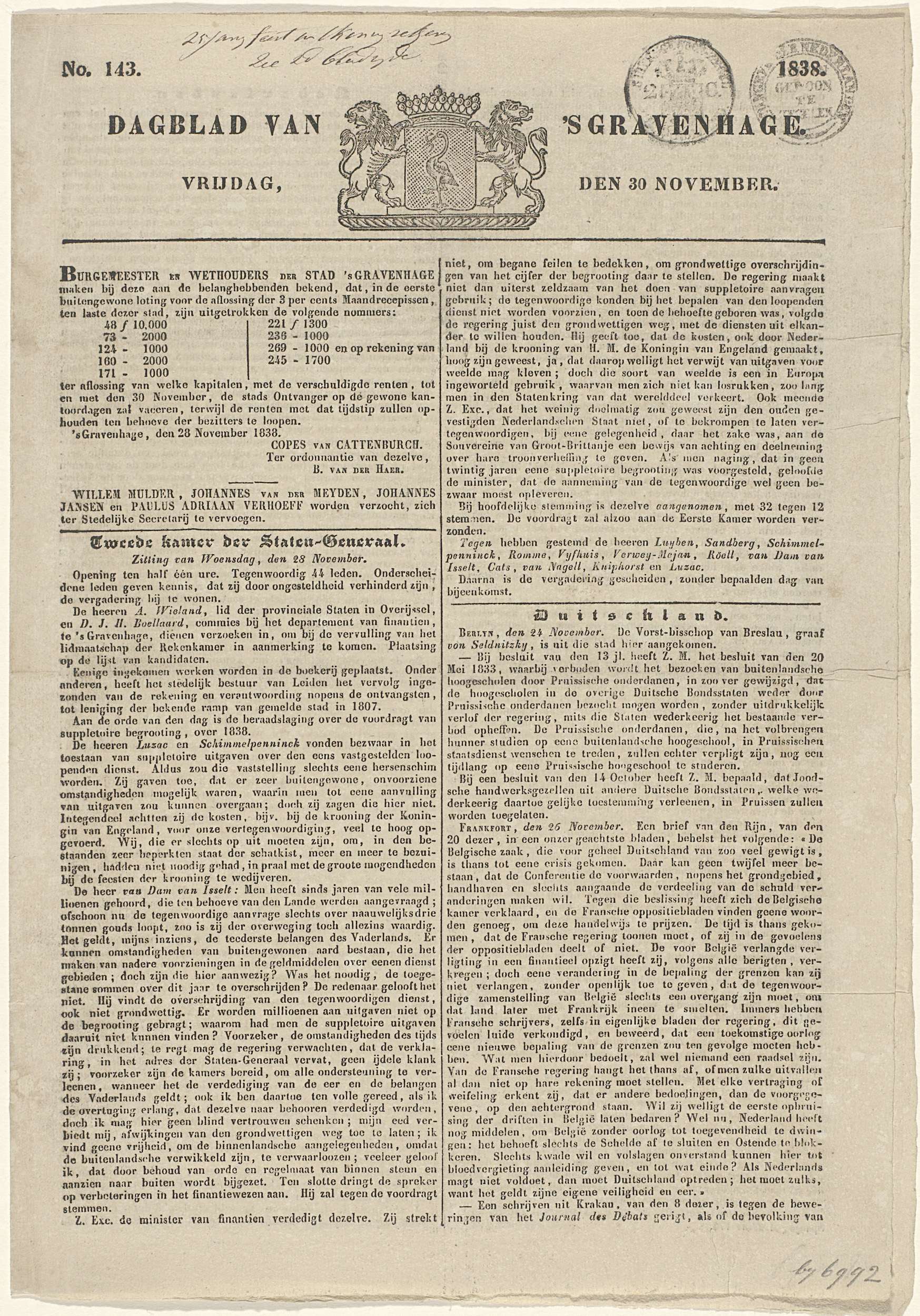 Herinnering aan de herovering van Nederlands onafhankelijkheid. Bijvoegsel tot het algemeen Handelsblad van 1. December 1838