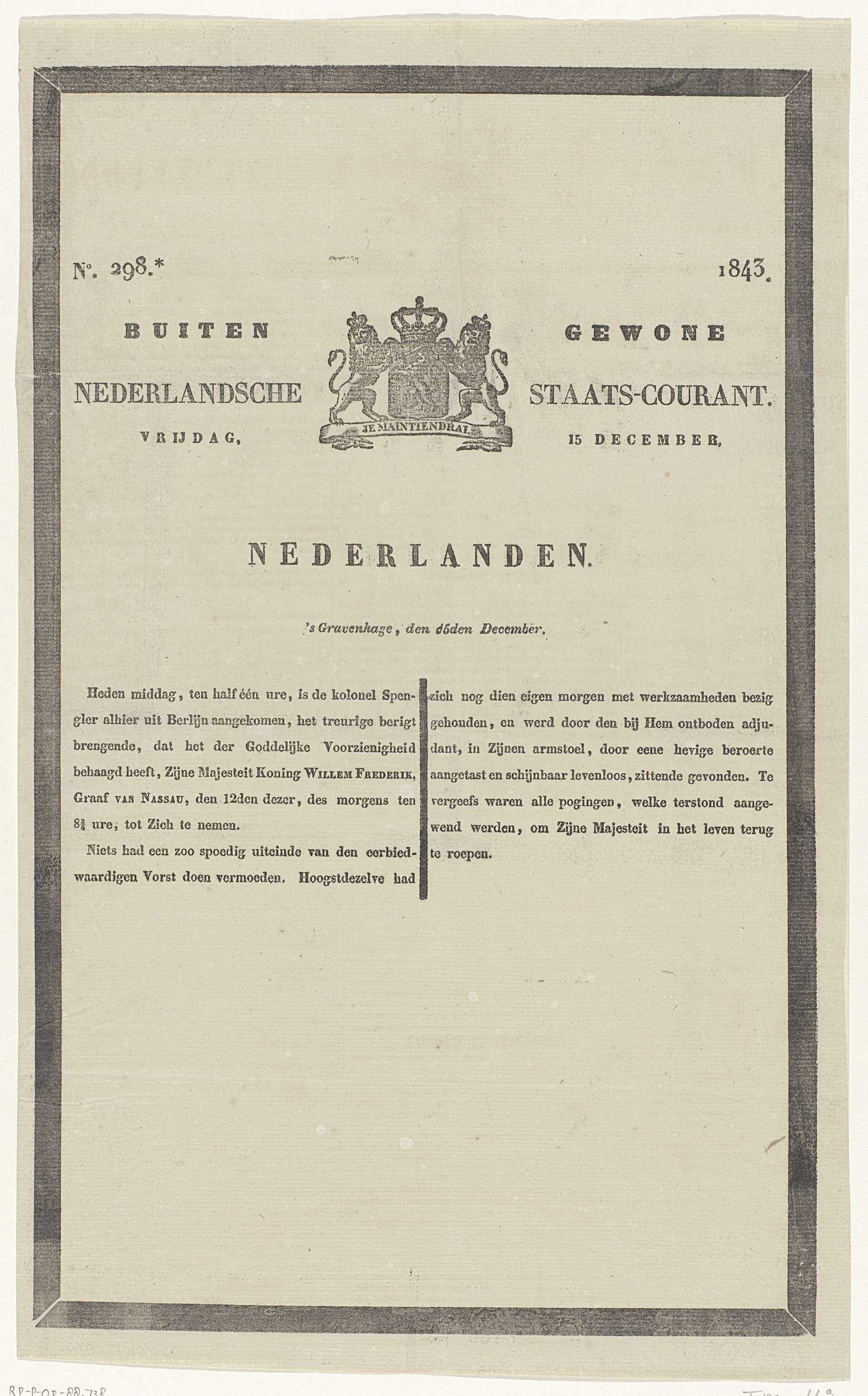 Buiten Gewone Nederlandsche Staats-Courant. Vrijdag, 15 December. No. 298*. 1843