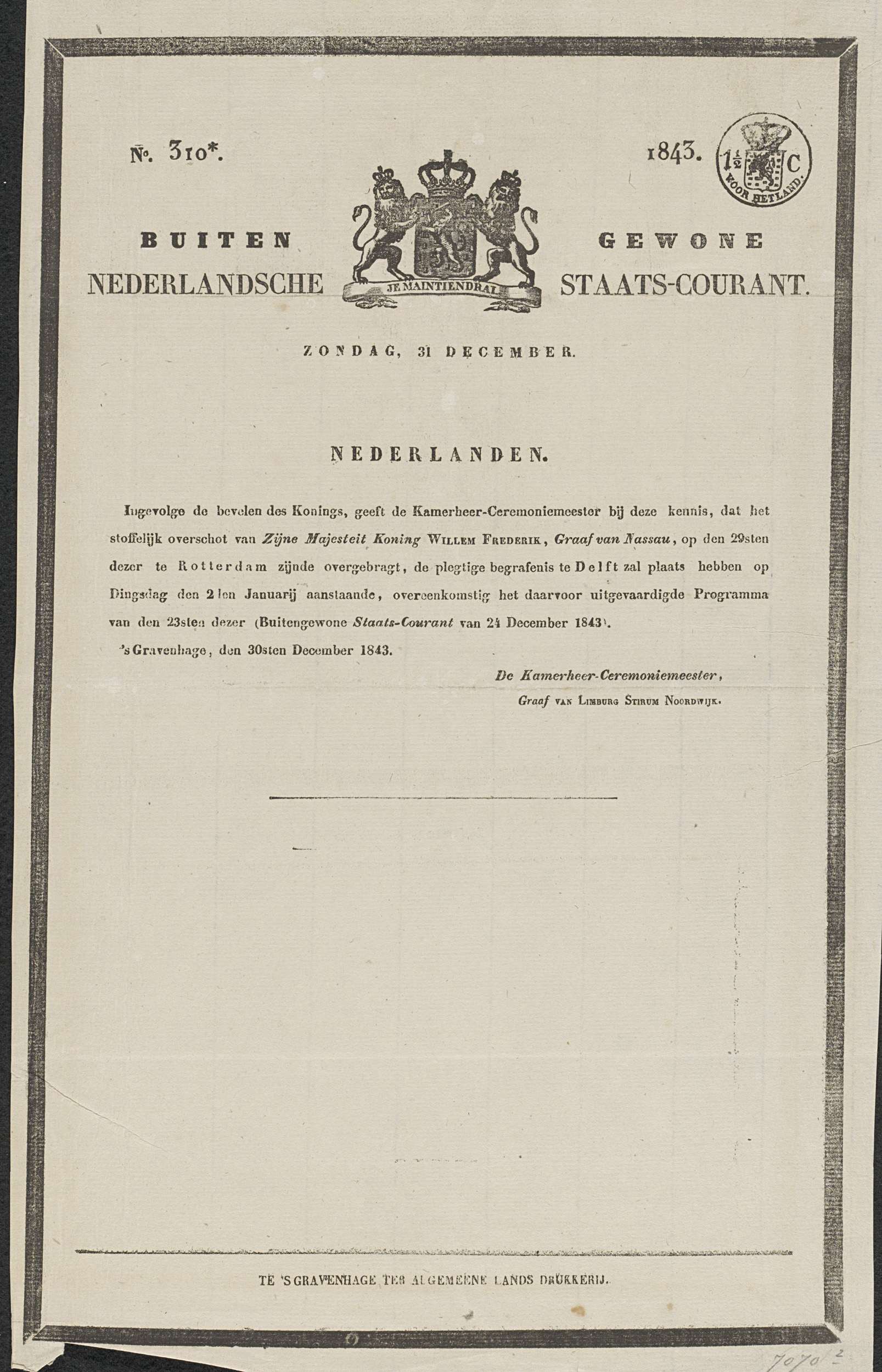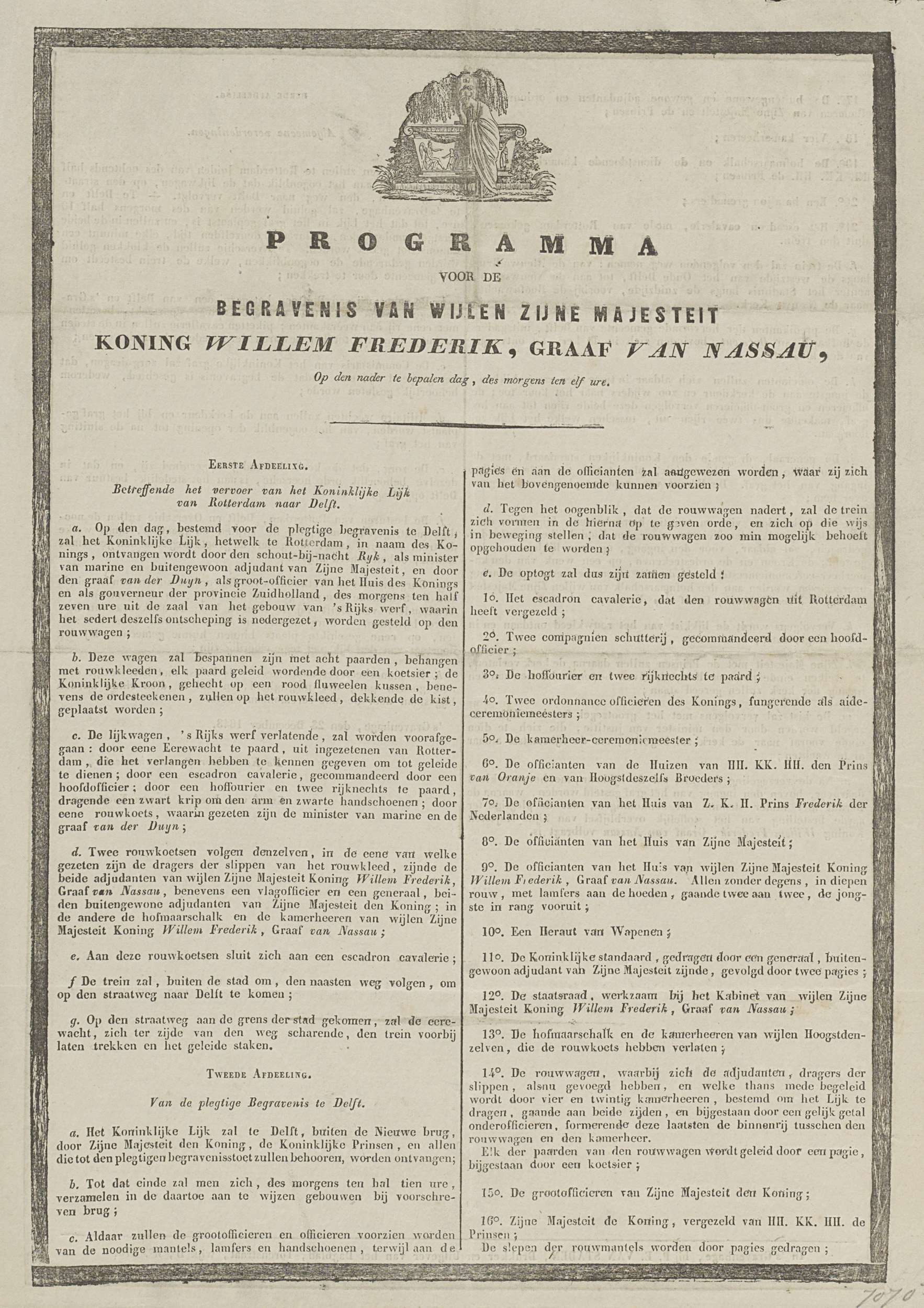 Programma voor de Begravenis van wijlen zijne majesteit Koning Willem Frederik, graaf van Nassau