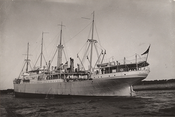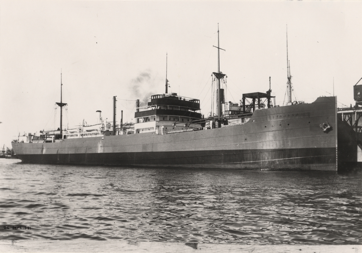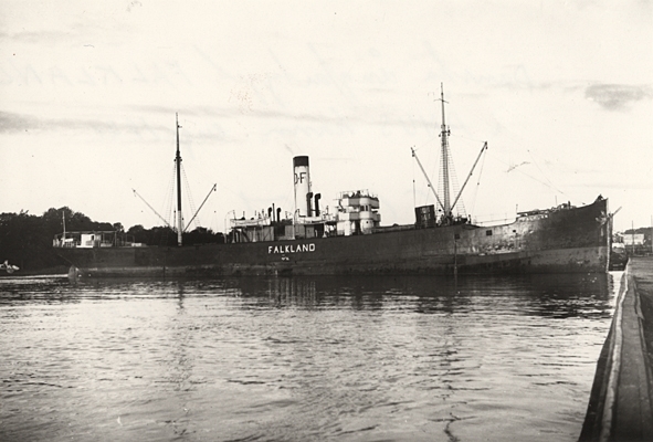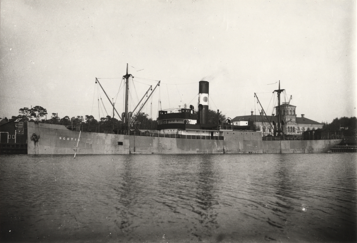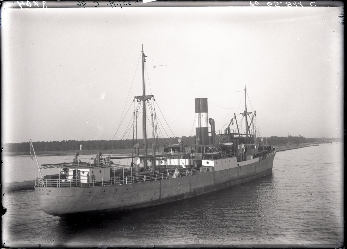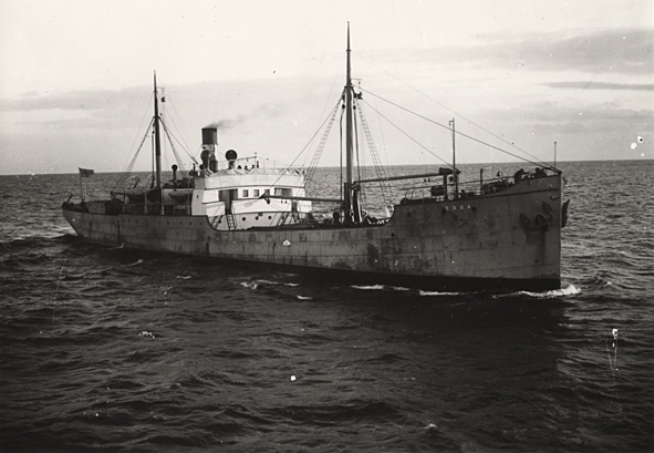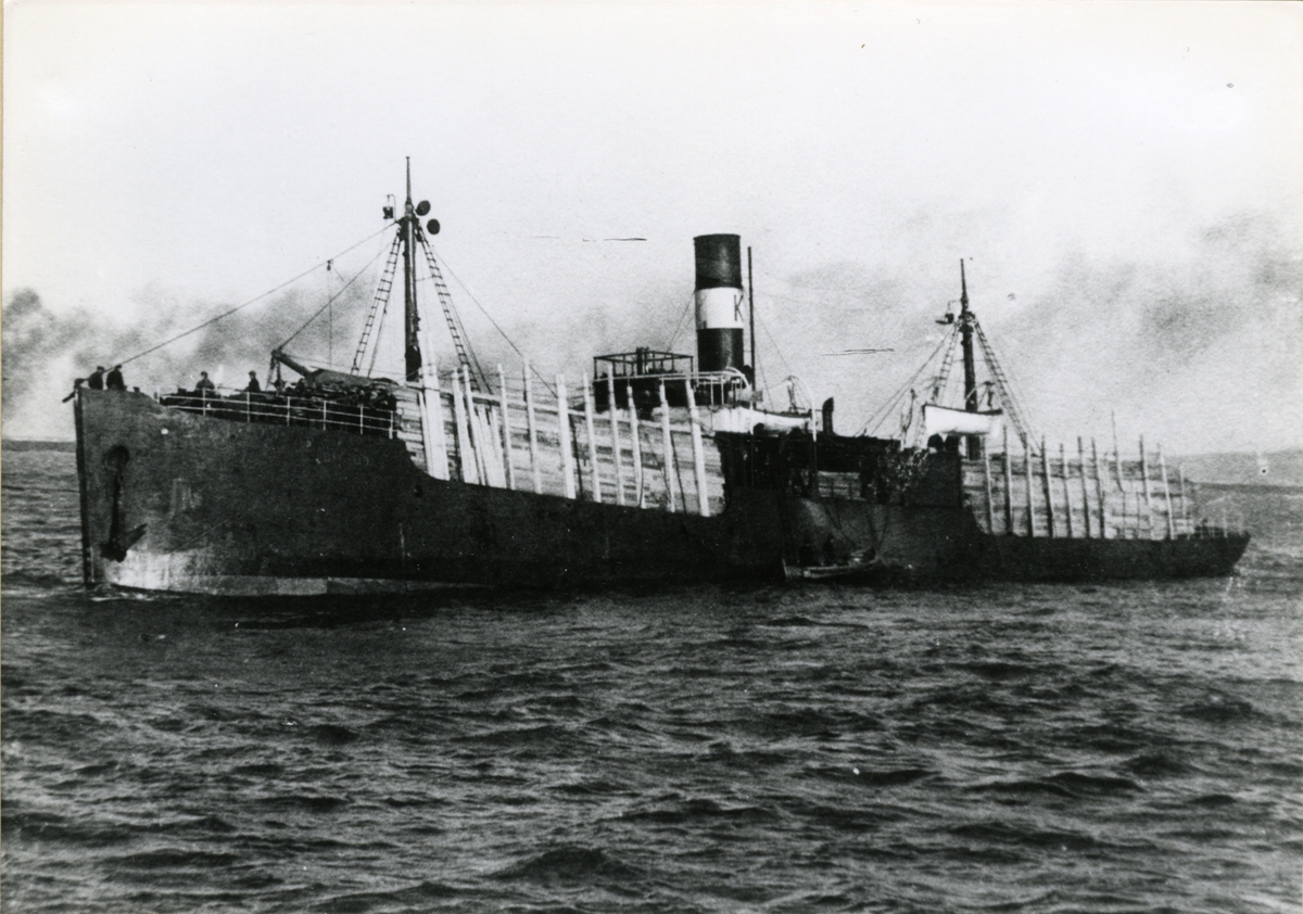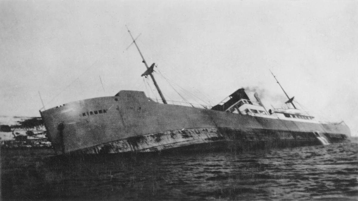 Lastångfartyget Kiruna av Stockholm, byggt i Göteborg 1921. Havererad vid New Foundland under första resan från Betwood sedan lasten, bestående av pulviserad malm, frusen och upptinad, förskjutits. Refoto: Marinens bilddet