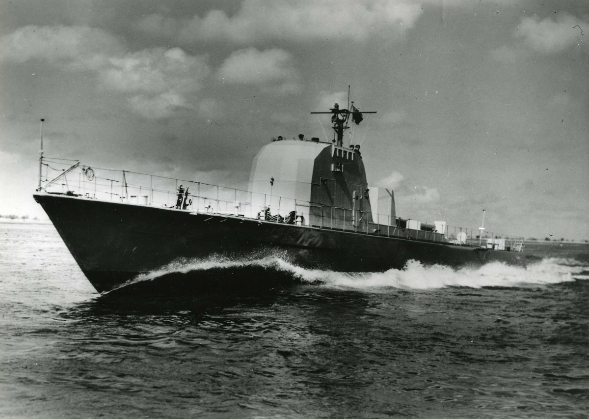 Foto i svartvitt visande lastmotorfartyget "GULLMAREN" i Köpenhamn under april månad 1954.
