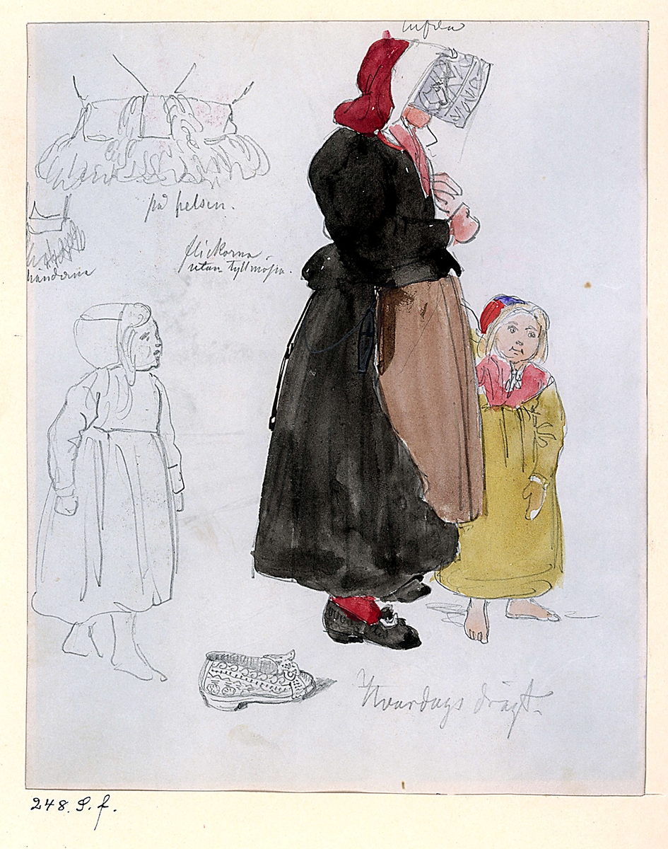 Folkdräkt, kvinno- och barn. Vardagsdräkt. Gagnef socken, Dalarna. Akvarellerad teckning av J.W. Wallander. Inv nr 57339h.