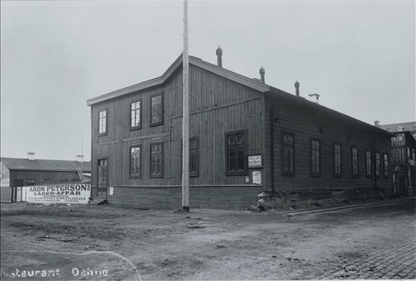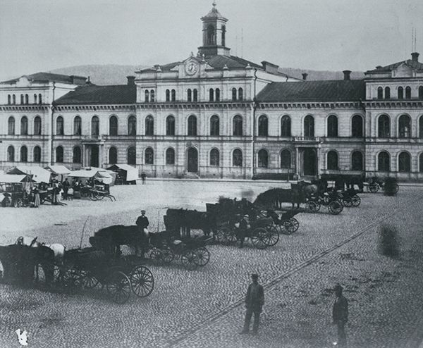 Bilden visar Stadshuset före stadsbranden 1888. Framför Stadshuset Stora torget med torghandel och ett antal droskor med kuskar.
