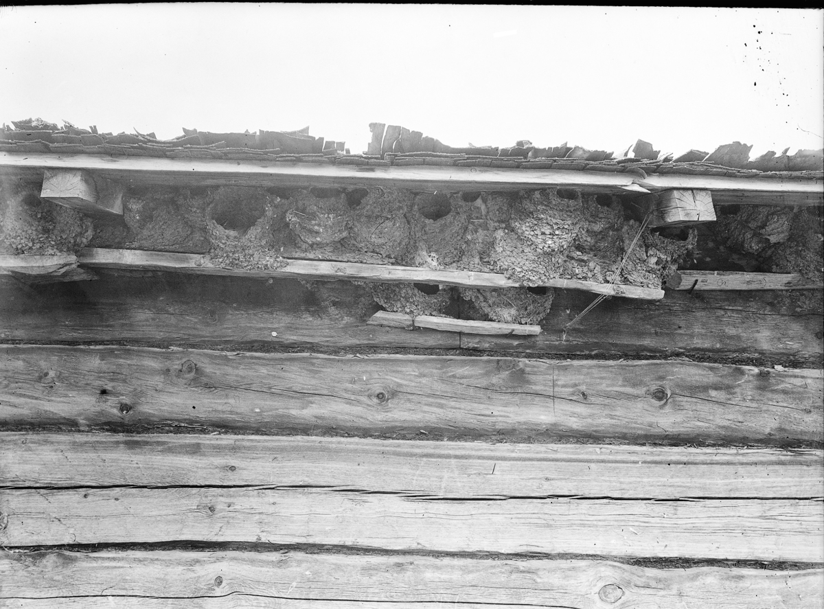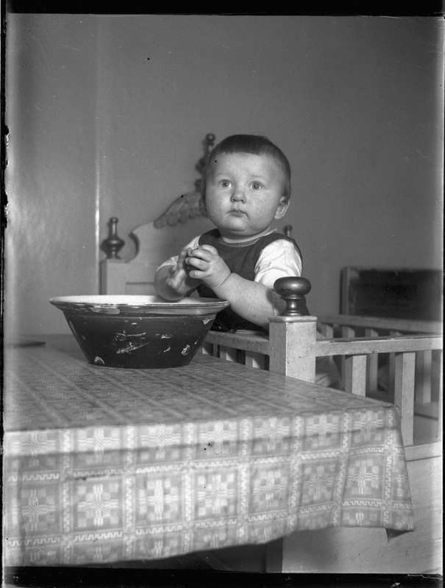 Sven Jonsson, Hjärtum 1915-05-14 står i sin spjälsäng som flyttats intill bordet där han fått någonting i en lerbunke