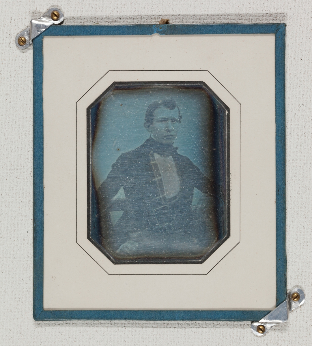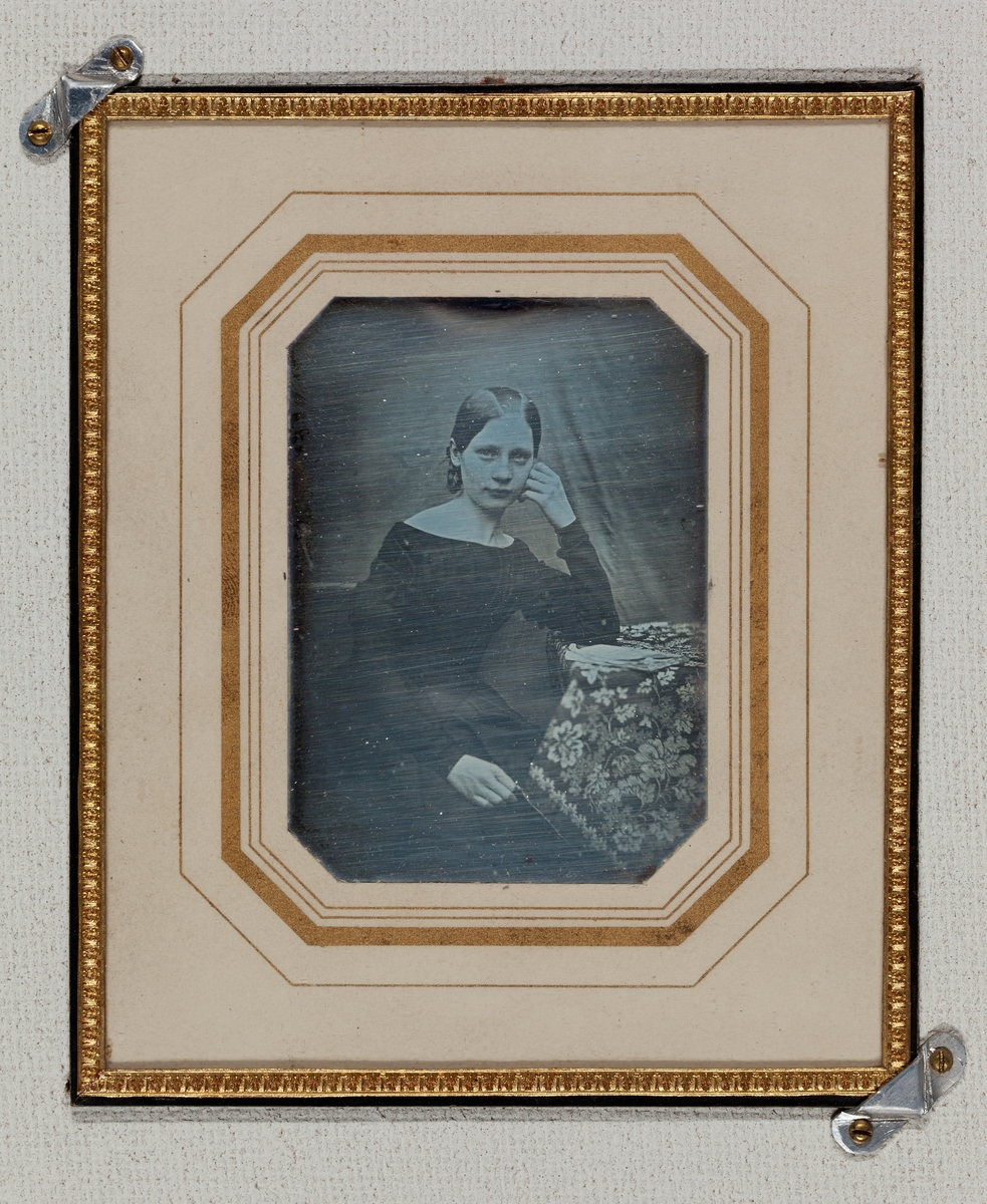 Undervisningsmaterial. Exempel på äldre fotografiska förfaranden. Daguerreotyp. Porträtt av okänd kvinna. Sent 1840-tal. Troligen taget i etablerad atelje.