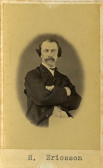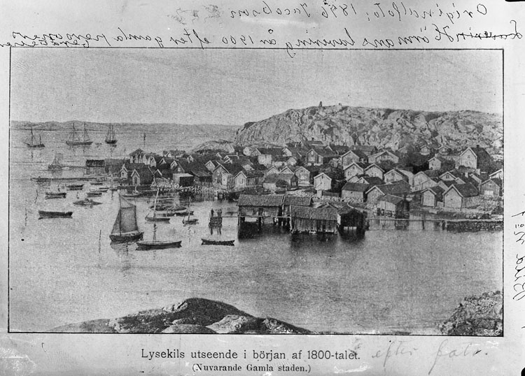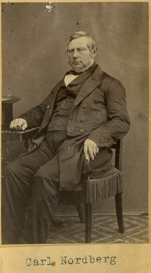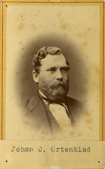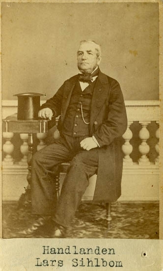 Text på kortets baksida: "Handlanden Lars Sihlbom, f. 1803 d. 1886. Hade före branden 1860 fastighet och affär vid Kungstorget (nuvarande Kungshuset)".