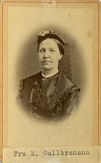 Text på kortets baksida: "Fru Matilda Gullbrandson g. m. SjötullsWaktmästaren Nils Gullbrandson, Uddevalla. Död 1 maj 1876, 65 å 7 m 15 d".