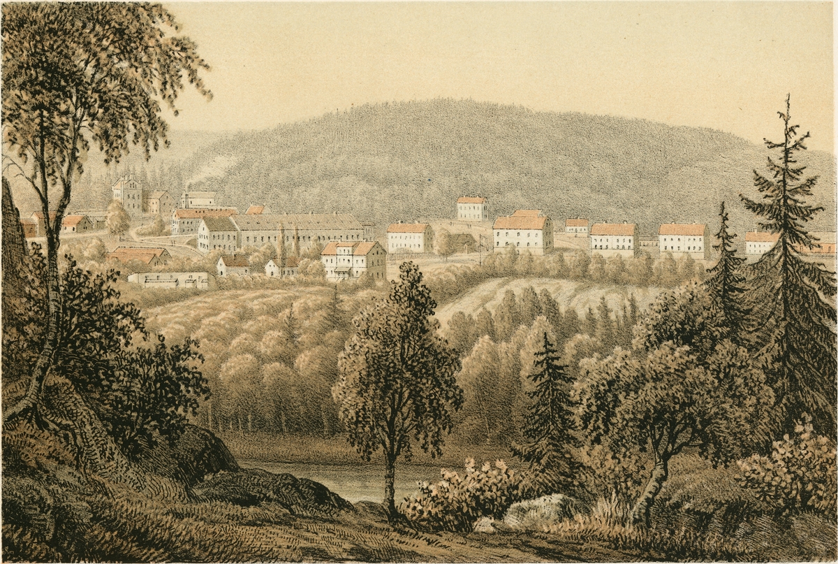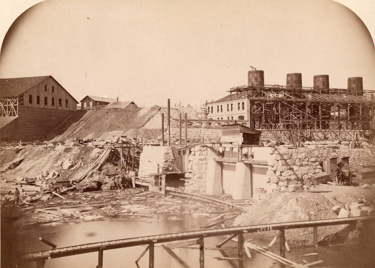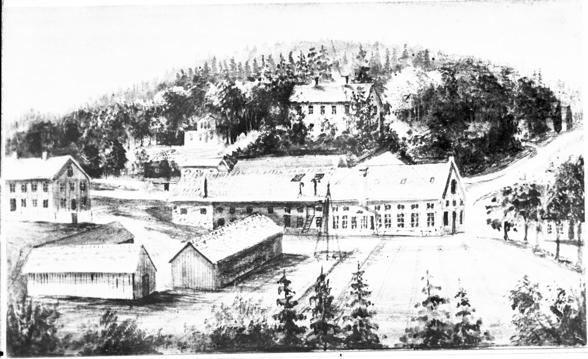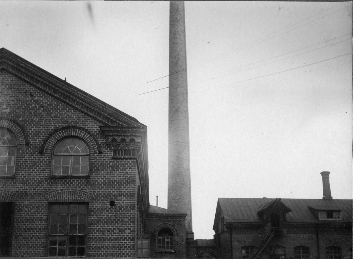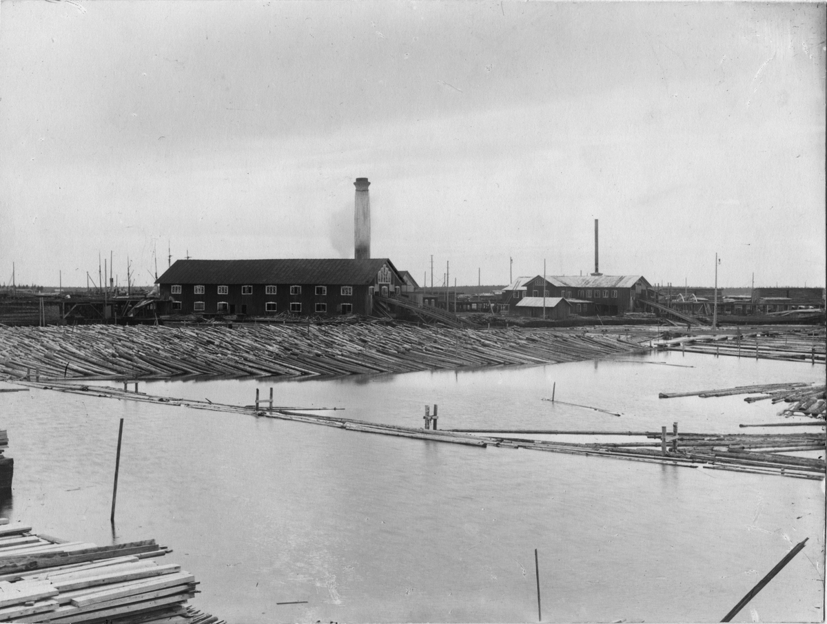 Karlsborgs Sågverk 1918. Till vänster maskinhus och ångpannehus. Till höger i fonden , gjuteri. Husen kvarstod efter branden 1925.