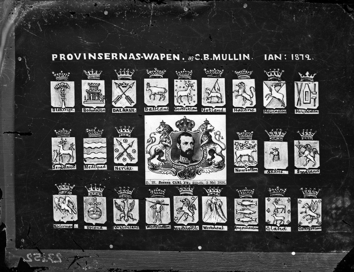 Glasnegativ, landskapsvapen, "Provinsernas wapen". af C.B. Mullin. Ian:1872".