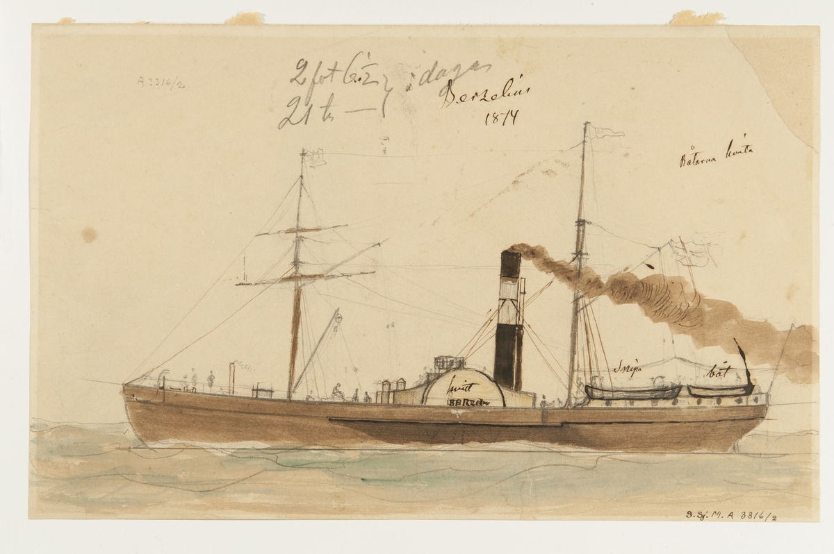 Samuel Owens Propellerfartyg, byggt 1816. Här ses vedrum, ångpanna av gjutet tackjärn och svänghjul. Bilden hämtad från Ny Illustrerad Tidning.