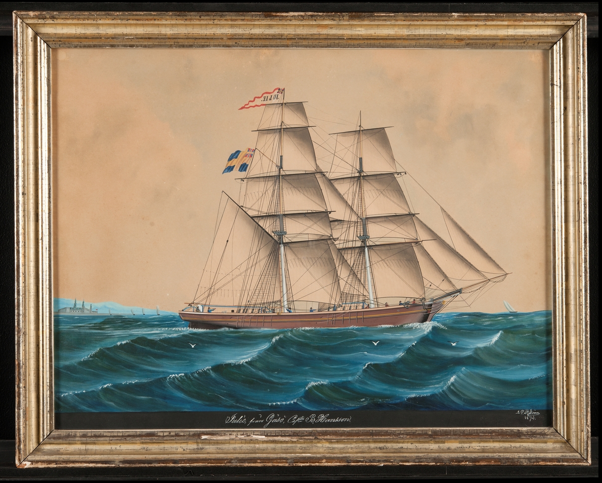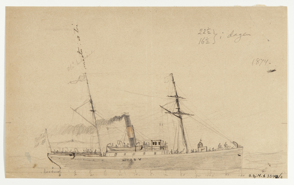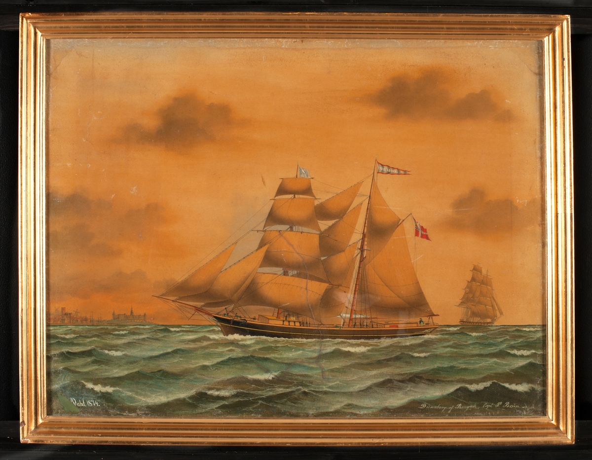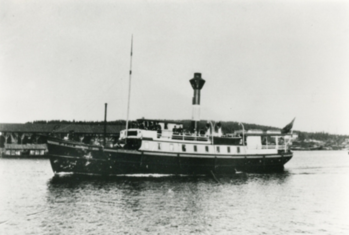 Hjulångfartyget BORE vid kaj. Glasad, ram i svart och guld.