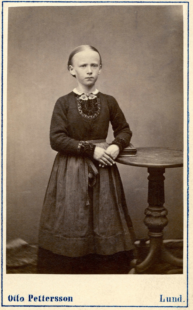 En flicka poserar stående lutad mot ett bord. Skåne. Inv.nr. 18536L.