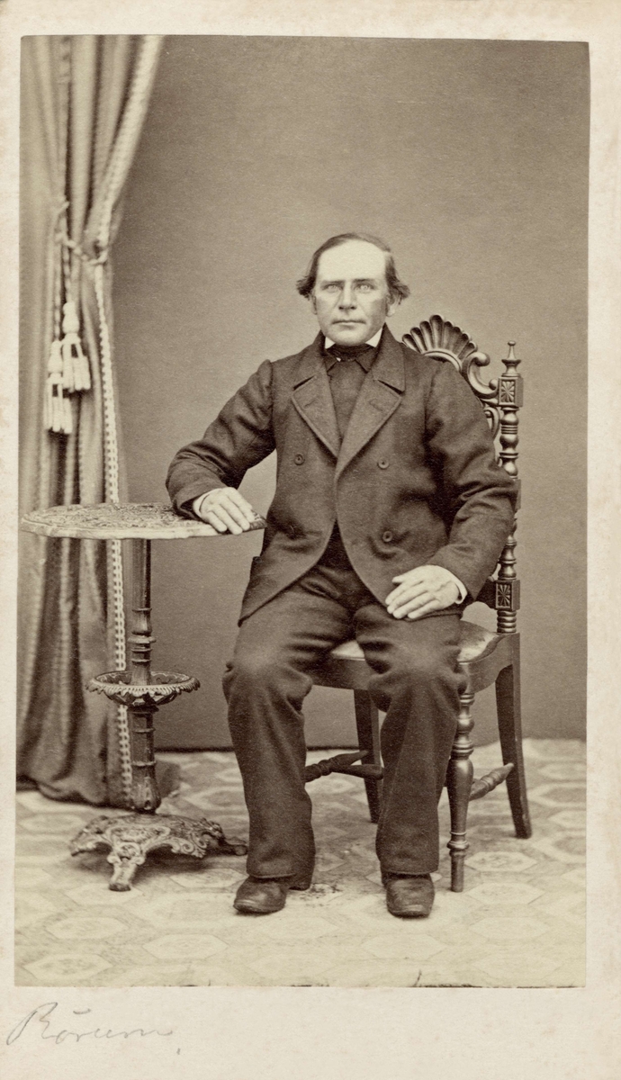 En man poserar för fotografen sittande, vilande armen på ett pelarbord. Rörum, Albo härad i Skåne. Nordiska museet inv. nr. 18533C.