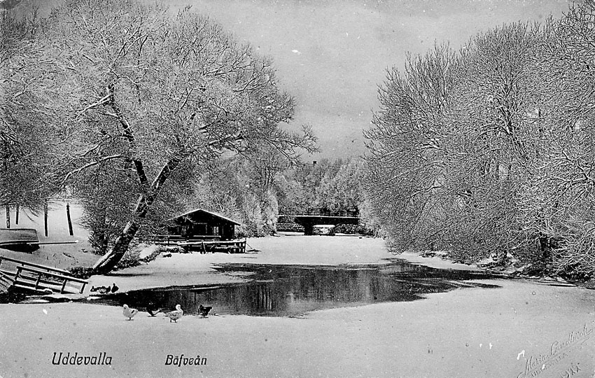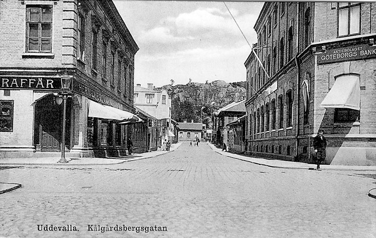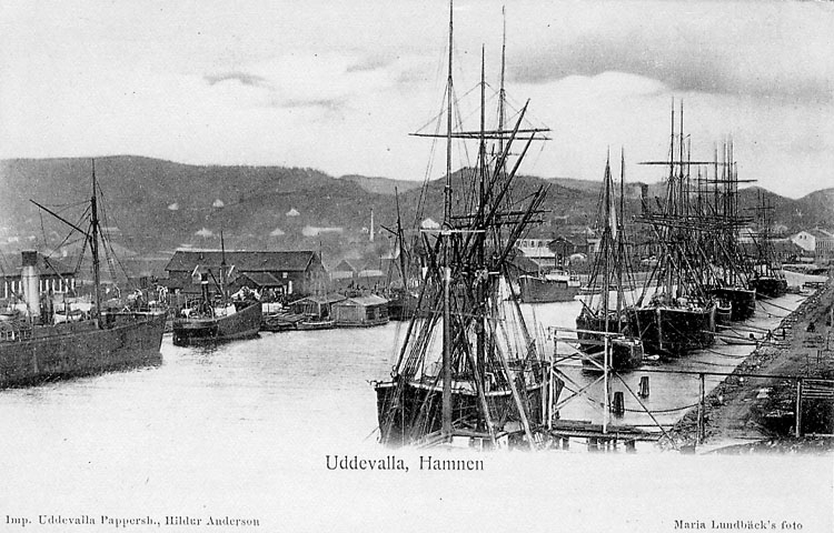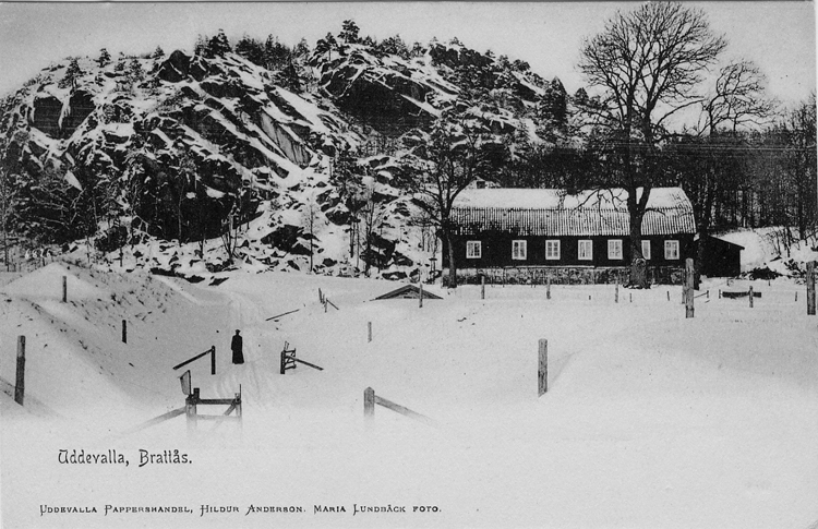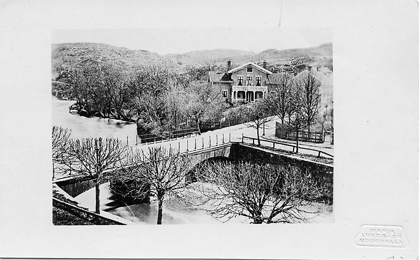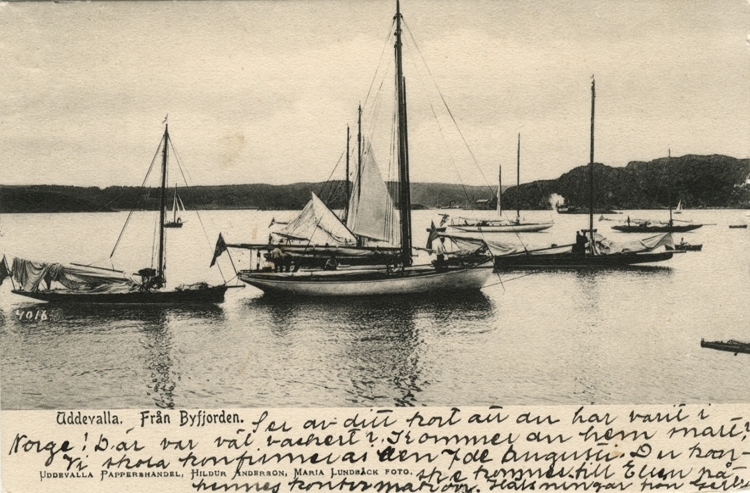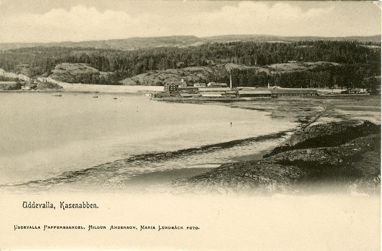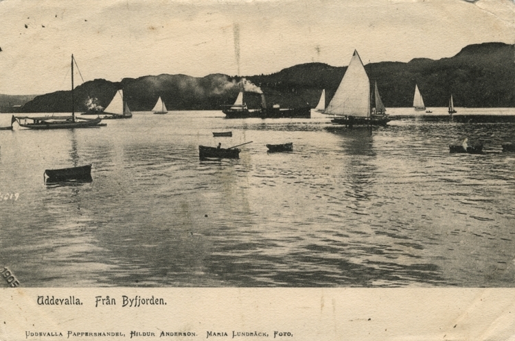 Tryckt text på vykortets baksida: "Uddevalla pappersh. Hildur Anderson imp. Maria Lundbäck foto."