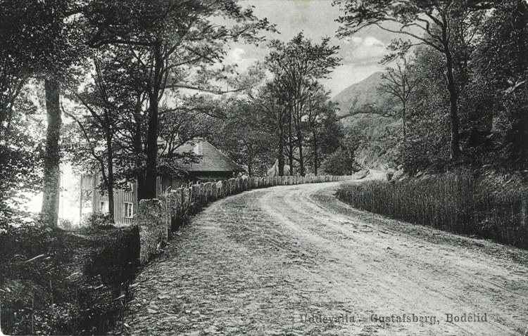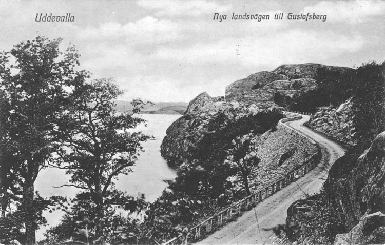 Tryckt text på vykortets framsida: "Uddevalla, Nya landsvägen till Gustafsberg."