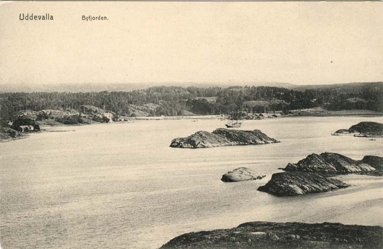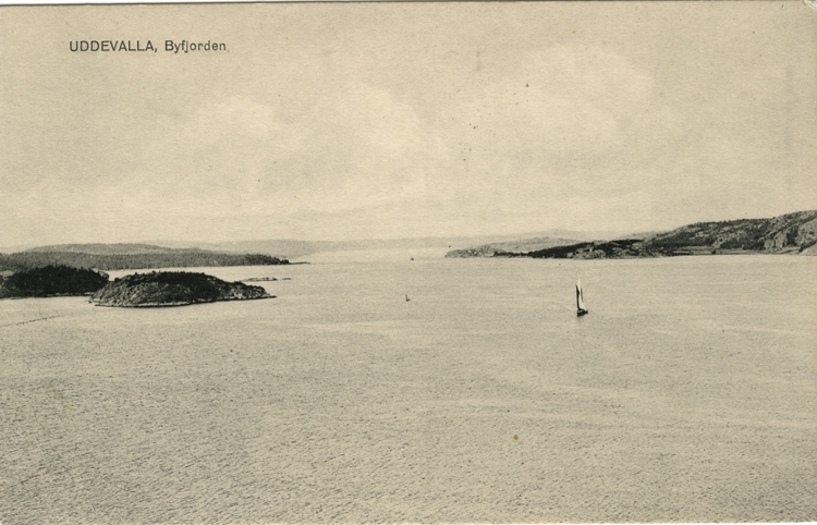 Tryckt text på vykortets framsida: "Uddevalla, Byfjorden."
