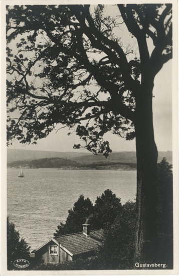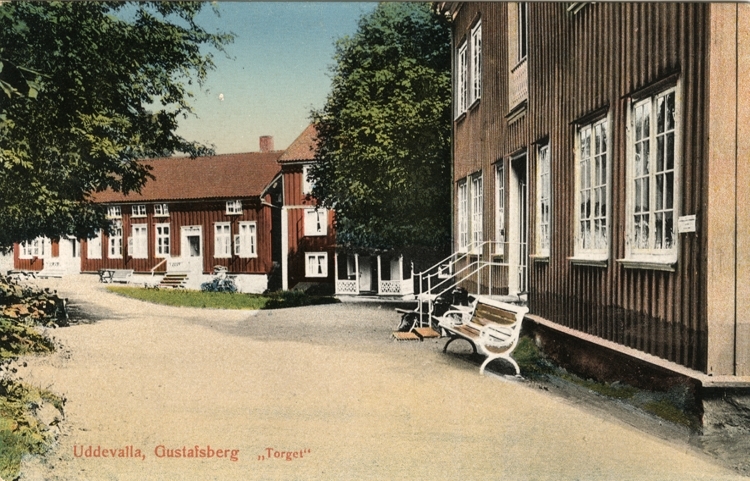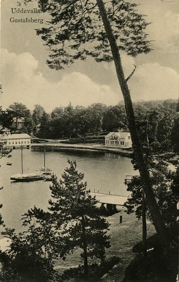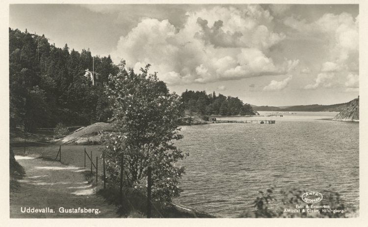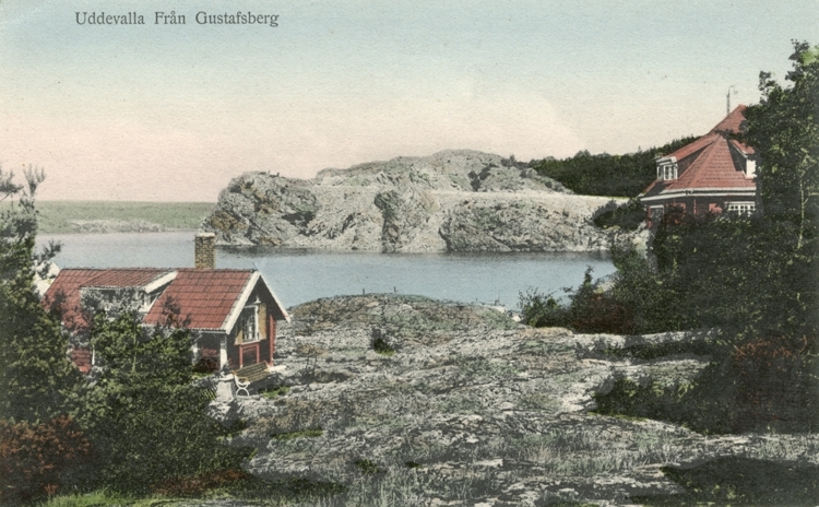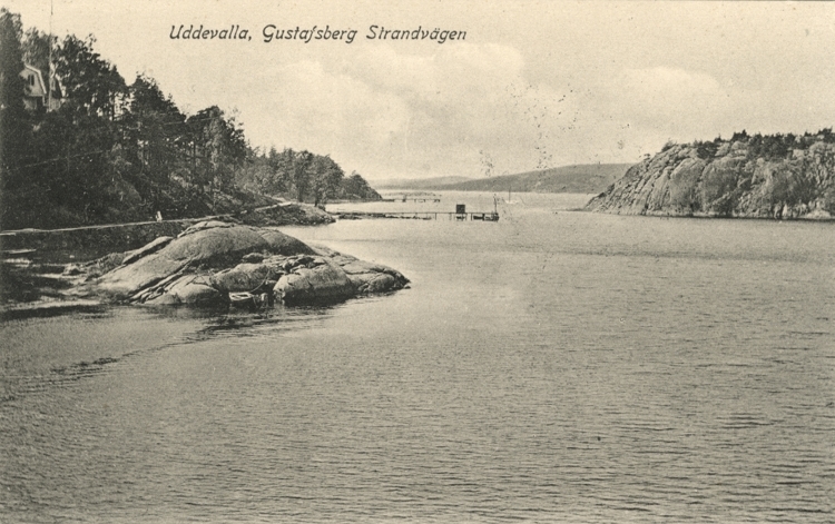 Tryckt text på vykortets framsida: "Uddevalla. Gustafsberg. Strandvägen."