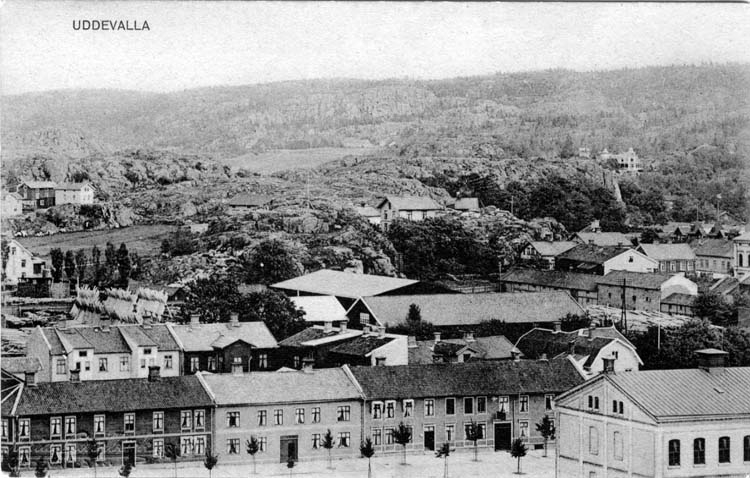 Tryckt text på vykortets framsida: "Uddevalla parti från Bohusbanan"