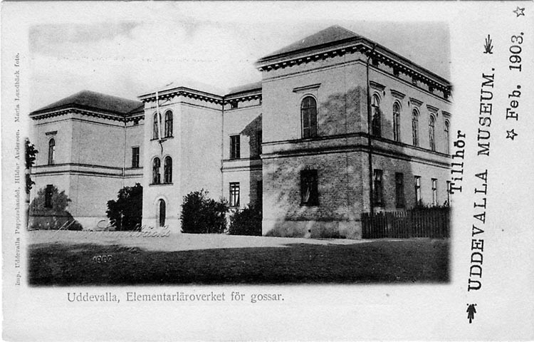 Tryckt text på vykortets framsida: "Uddevalla. Elementarläroverket för gossar".